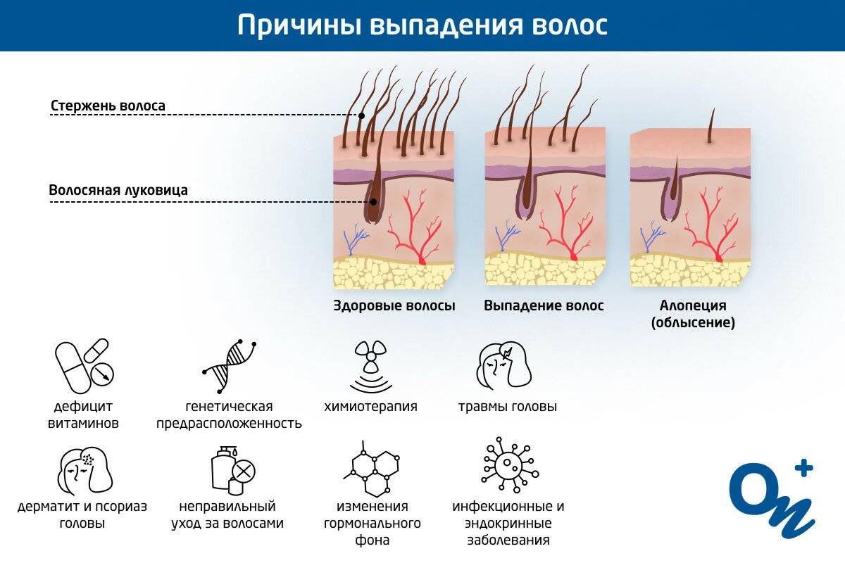 При выпадении волос развивается алопеция — облысение. Склонность к андрогенной алопеции передается по наследству. Выпадение волос также может указывать на нарушения в работе внутренних органов.