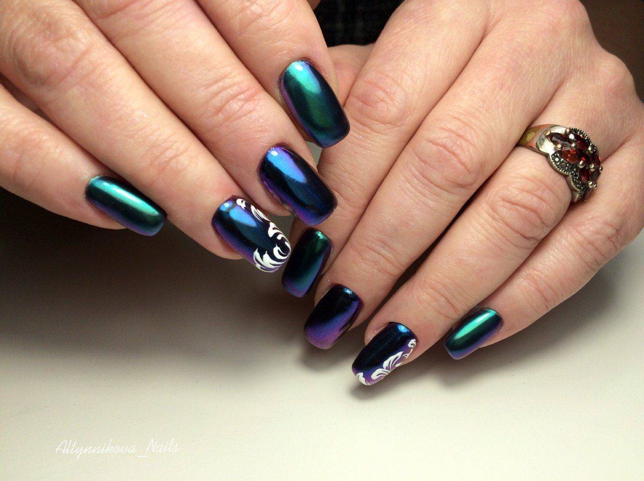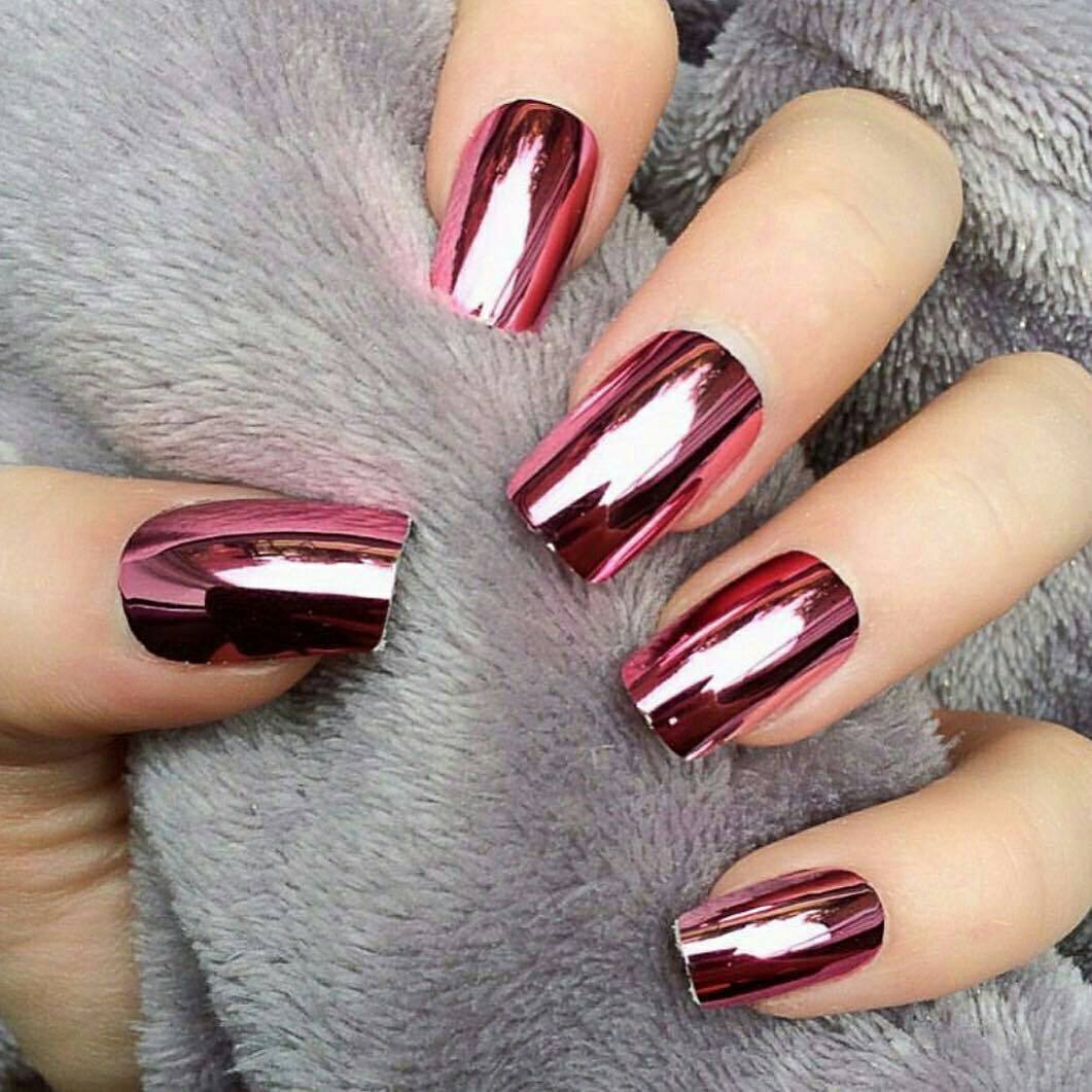 Необычность такого нейл-арта заключается в использовании специального покрытия, которое зрительно напоминает зеркало или отшлифованный металл.