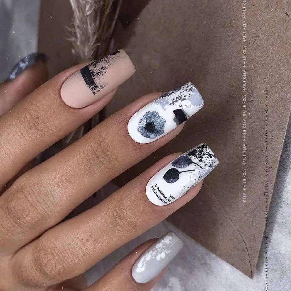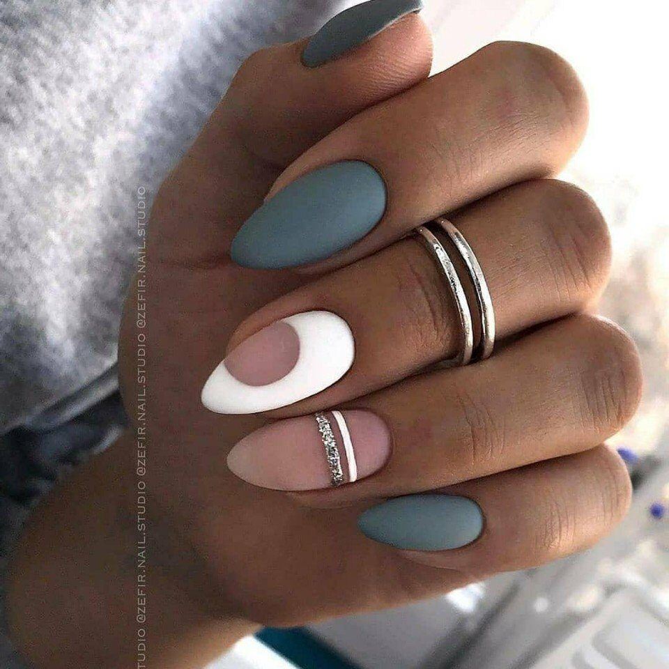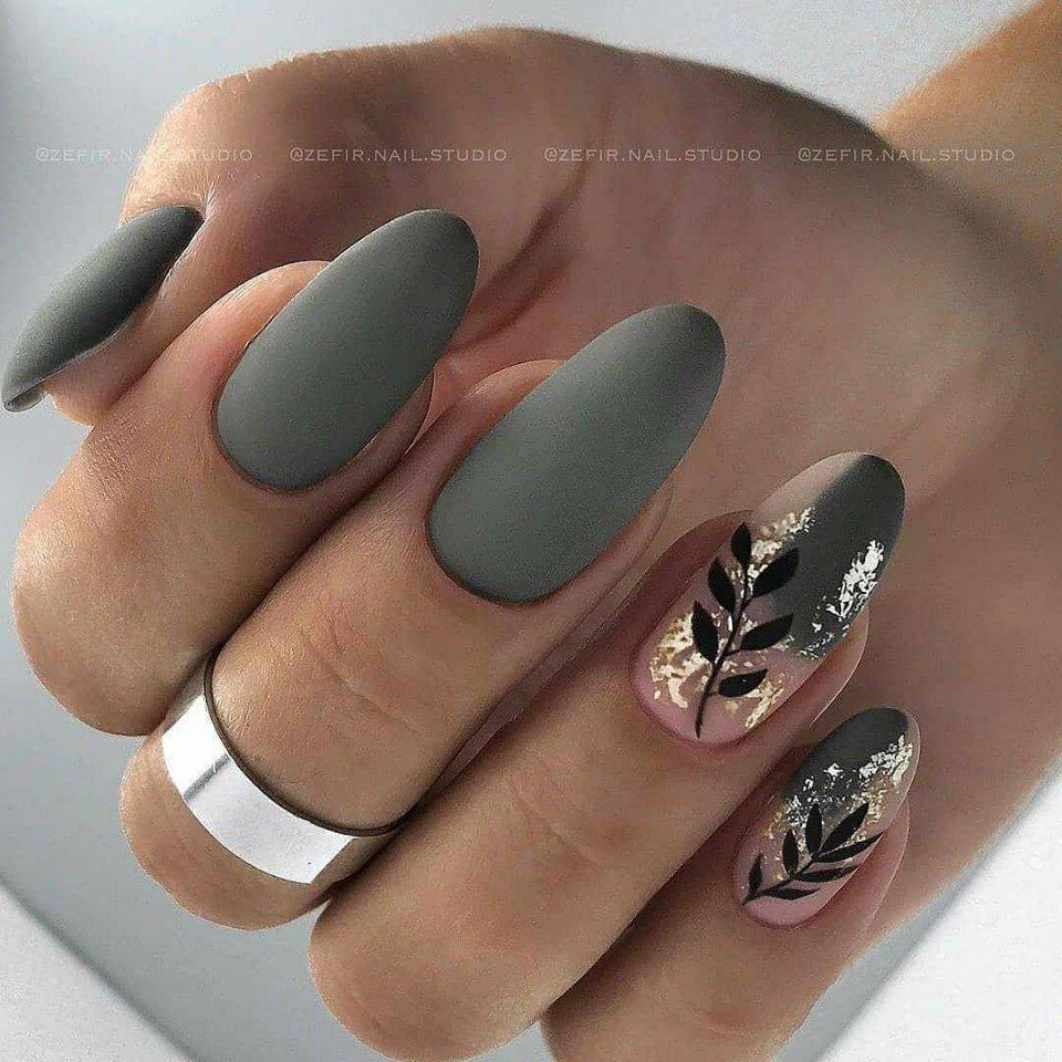 В трендах серого маникюра находится именно матовый маникюр. Матовый серый цвет смотрится стильно, минималистично и не вызывающе. Дополняют такой маникюр, обычно, геометрическими фигурами, сдержанными рисунками или линиями.