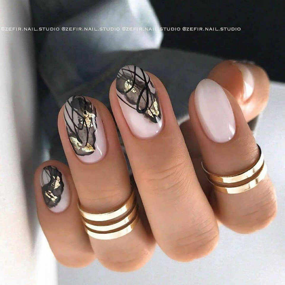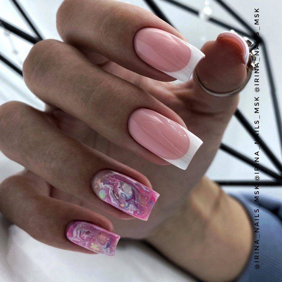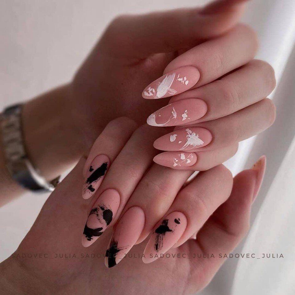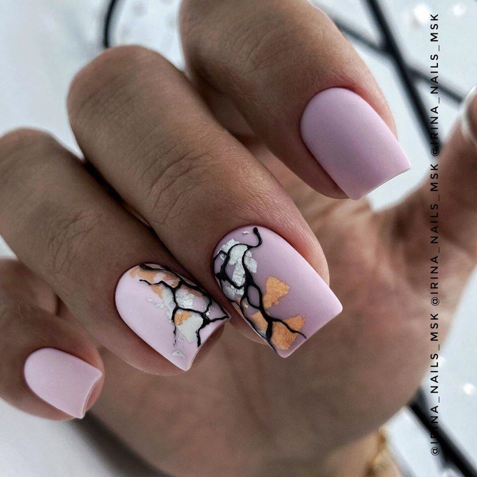 Стильно выглядит матовый гель лак в дуэте с белым мраморным дизайном на отдельных ноготках.