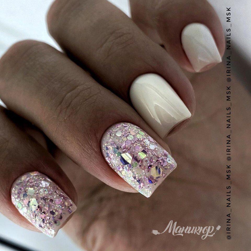 Вариант «битого» маникюра также прекрасно может быть выполнен в серой палитре. Ногти станут переливаться различными красками, что придаст праздничность вашему образу.