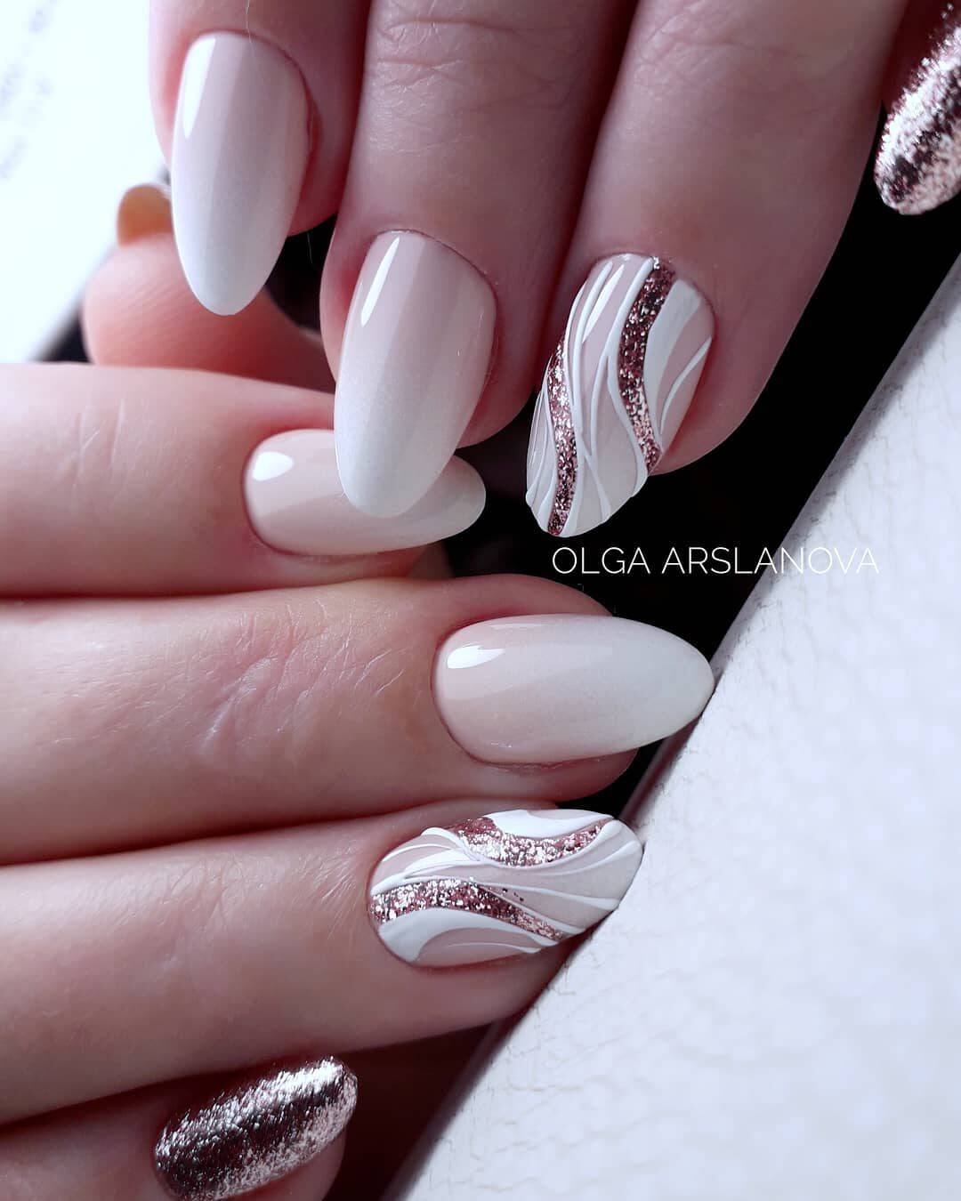 В основном, чтобы переплетение линий получилось искусным, подбирается спокойный, пастельный базовый тон, и узор таким образом раскрывается во всей красе. Дымчатый будто создан именно для этого! Выводить вензеля рекомендуем на нем, а соседние ноготки покрывать контрастными, яркими оттенками или украсить стразами.