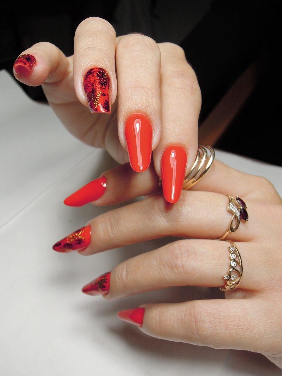 Используя красный лак на длинных ногтях, необходимо соблюдать осторожность. Кричащие оттенки могут смотреться вульгарно, поэтому лучшим выбором станут спокойные варианты, разбавленные белыми вкраплениями. Модные тенденции 2021-2022 предлагают разнообразить классический френч фантазийным дизайном одного или двух ногтей в красной цветовой гамме