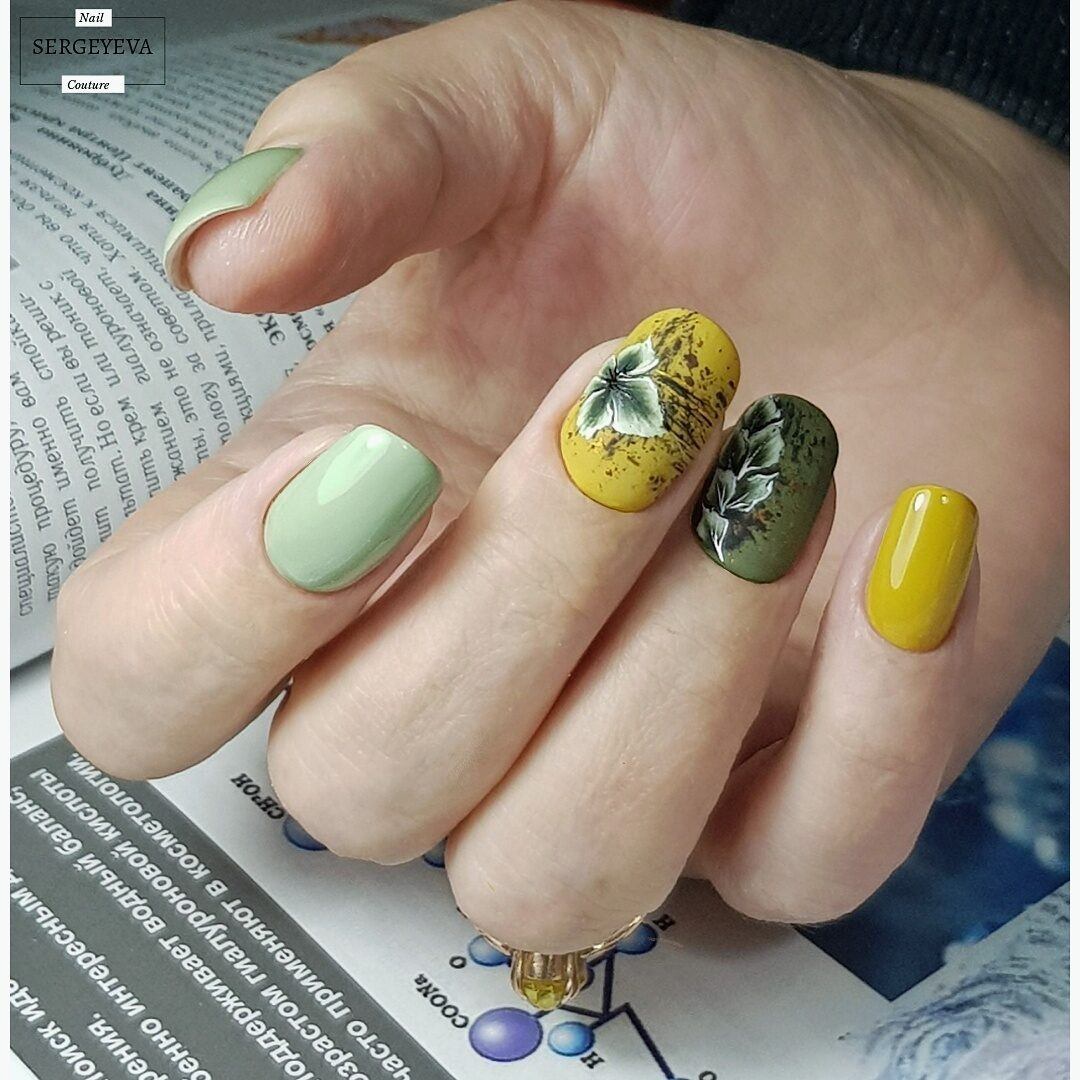 Зелёная палитра имеет множество оттенков, поэтому маникюр в подобном исполнении может носить самый разный характер, начиная от нежного, романтического и заканчивая ярким, броским и даже смелым решением. Светлые оттенки очень гармонично смотрятся с аналогичными розовым, бежевым, желтым или ярким красным цветом. Эти сочетания идеально подходят для создания фруктового или цветочного дизайна, плавных переходов градиента или дизайна в стиле колор блок. Темные зелёные оттенки при этом чудесно смотрятся с чёрным и серым лаком, а также с серебром или золотом. Матовый нейл, различные вариации мраморного маникюра и ноготки, украшенные элементами «битого стекла», стразами или россыпью кристаллов являются прекрасной демонстрацией такого стильного сочетания.