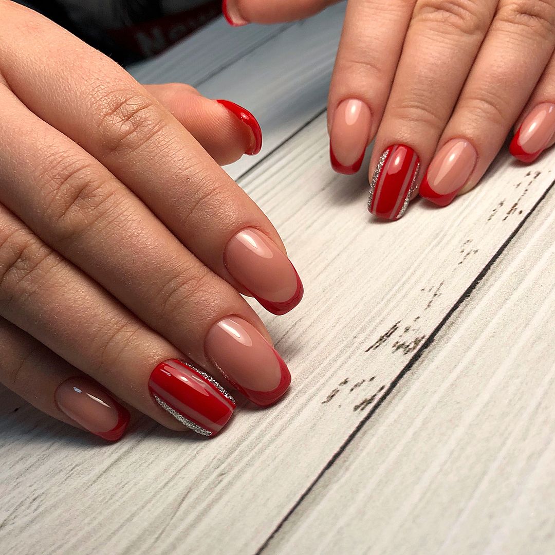Что касается покрытия в красном цвете, то его чаще всего выбирают для посещения мероприятий. Столь яркий френч можно дополнить дизайном в виде абстракции, кружева, геометрии или цветочного рисунка. Каждый из них по-своему хорошо украшает классику. Дополнительный декор в данном случае все также уместен. Поскольку многое зависит от размера блесток и их количества. Цвет таких деталей лучше выбирать исходя из наряда, который вы планируете надеть на торжество. Наибольшей популярностью пользуются золотистые и серебристые блестки. Считается, что они всегда будут уместными.