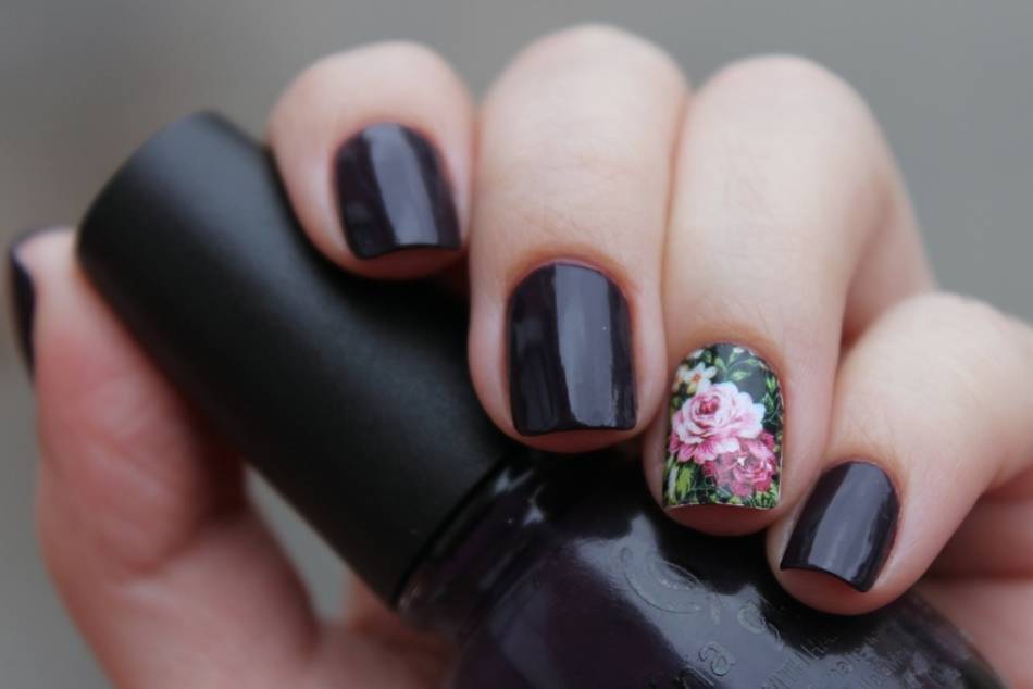 Клеящиеся картинки, когда маникюр с покрытием уже сделан, помещают на 30-60 секунд в воду комнатной температуры, после чего вынимают, отделяя от бумажной основы.