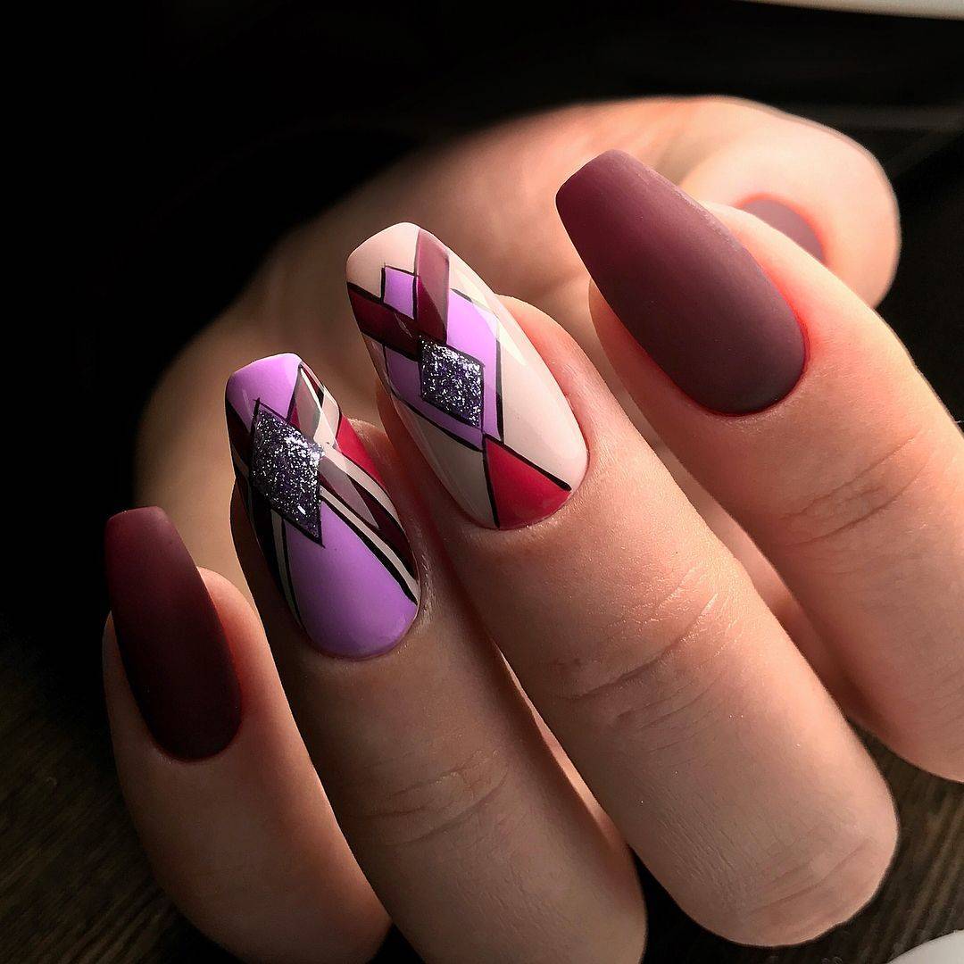 Осенний маникюр 2020 года можно дополнить пенным дизайном ногтей в топовых цветах сезона: бордовый, синий, черный, фиолетовый.