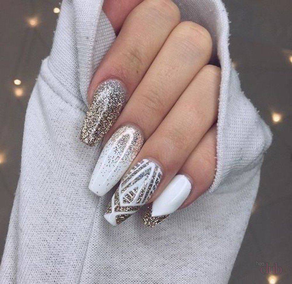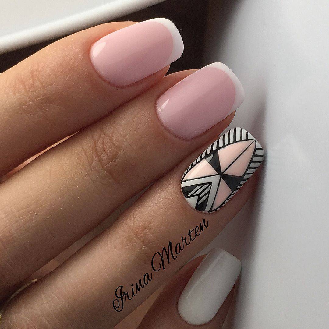 Прекрасной идеей будет покрыть несколько ногтей ярким оттенком, а остальные – белым гелем-лаком с тонкой полоской серебристой фольги или геометрической фигурой черного цвета на нем.