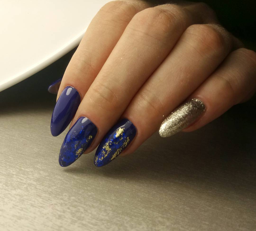 Именно фольга снимает банальность, например, черно-желтого сочетания. На длинных ногтях можно располагать геометрически организованные кусочки фольги, или пусть она выглядит как благородная амальгама. Фольга может быть не только золотистой или серебристой, но и радужной/цветной.