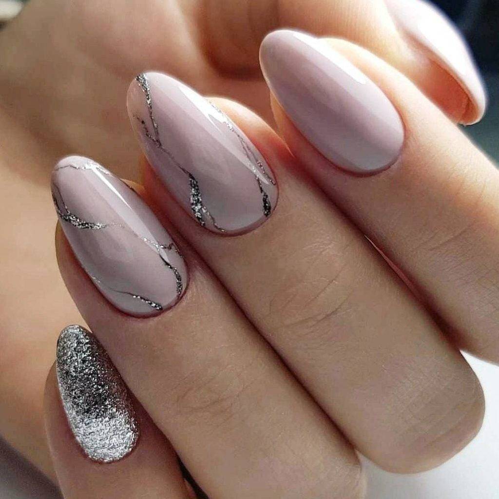 Подчеркнуть мраморный маникюр можно с помощью глиттера или тонких полос из фольги.