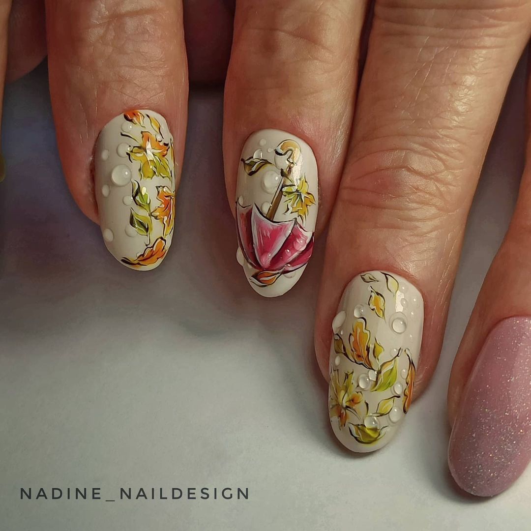 Представить сезон осени может мотив, выполненный готовыми наклейками-слайдерами на нескольких ноготках изображением листиков или зонтиков. Для осуществления акцента на определенные пальчики не требуются навыки профессионала, с наклейкой может справиться любой новичок.