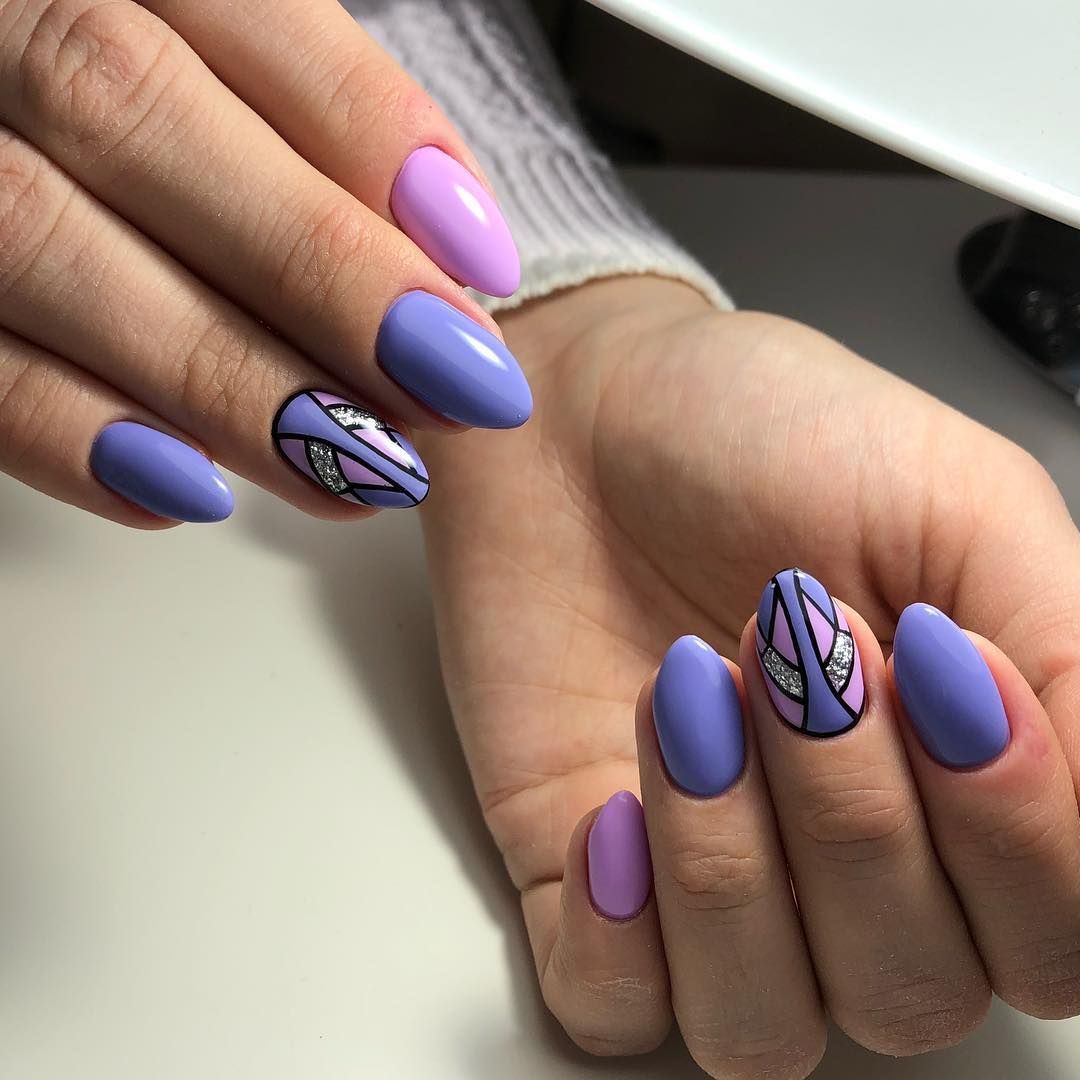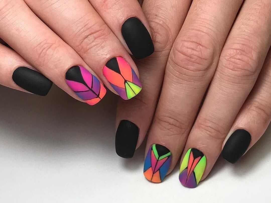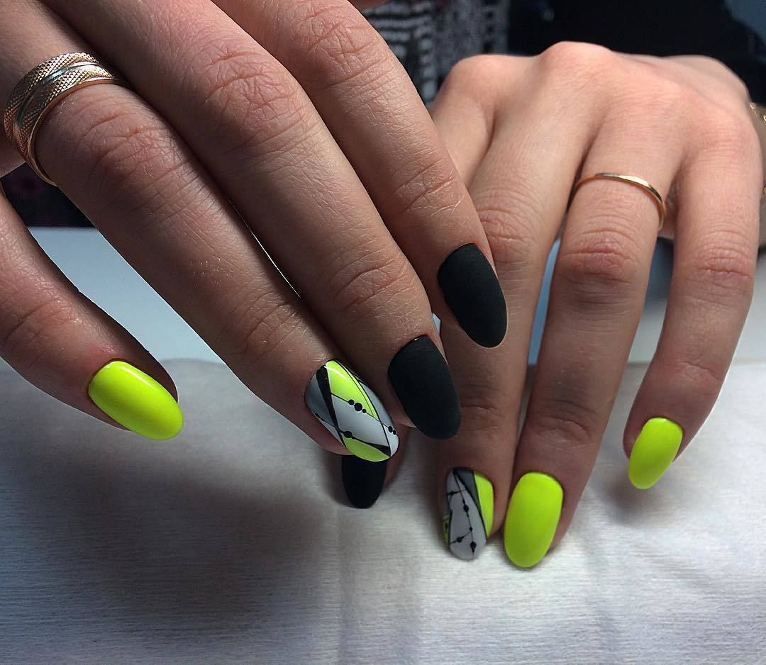 Хитом считается «ломаный» дизайн: вдоль пластины чертится тонкая чёрная линия, правая часть окрашивается ярким цветом, а левая – натуральным либо прозрачным без блеска.