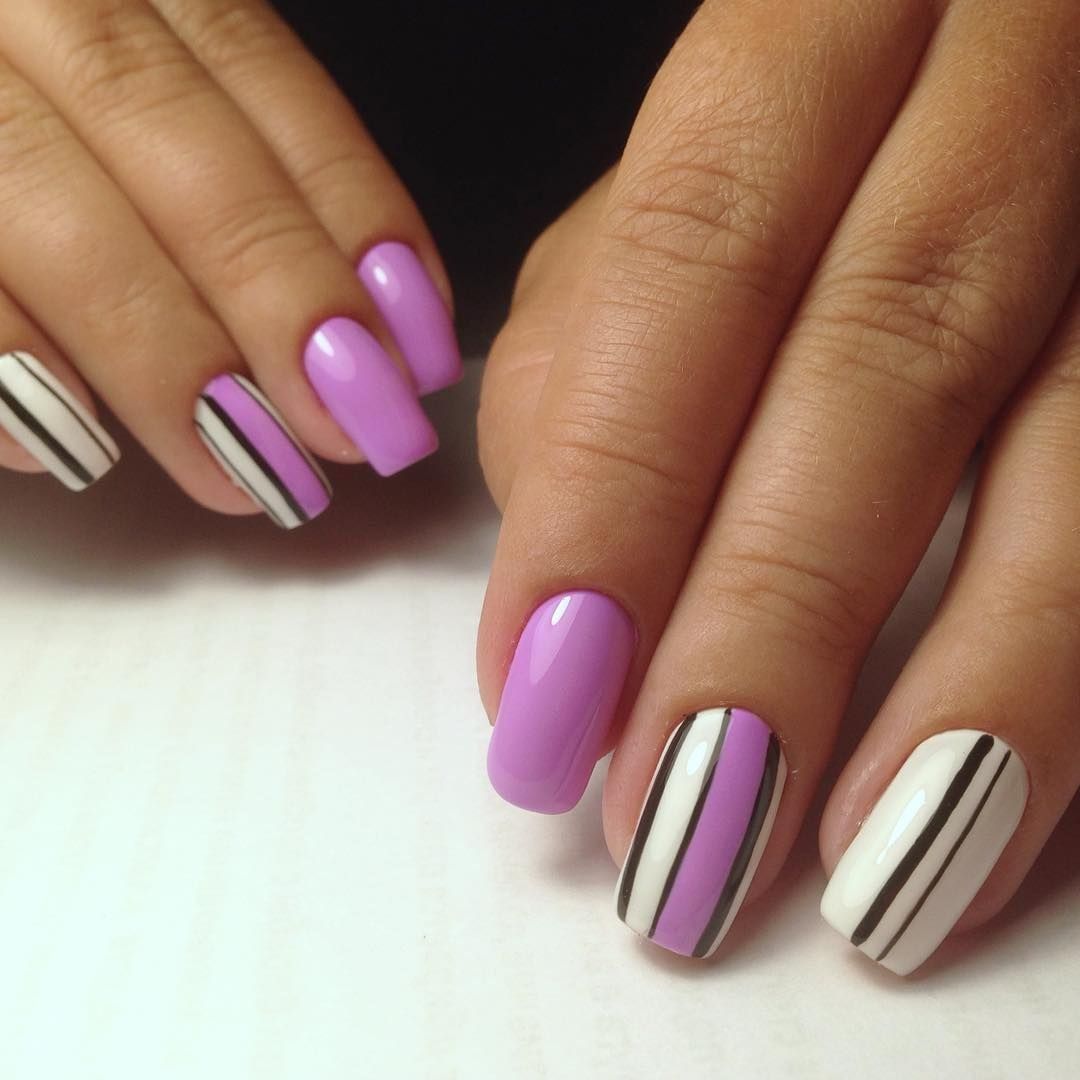 - В середине ноготка нарисуйте контрастным цветом полоску или же просто нанесите полосы из точек. После этого не просушивайте лак, а сразу переходите к росписи.