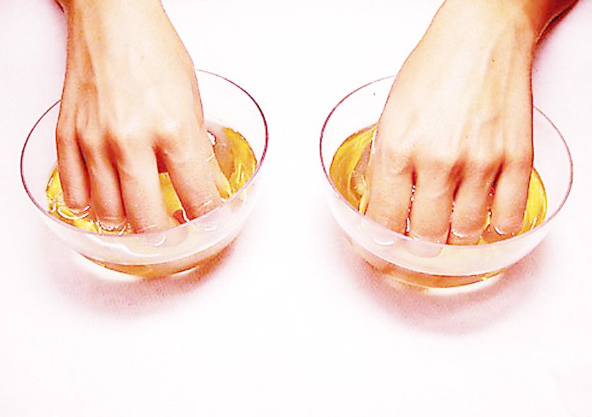 Соединить все компоненты, держать руки в ванночке 15 минут. Можно добавить эфирные масла или заменить воду травяным отваром. Затем руки вытереть насухо, сделать массаж пальцев с питательным кремом.