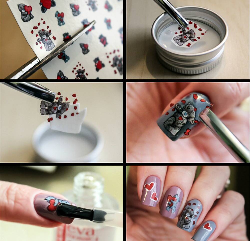 Перед нанесением лака и наклеек, нужно обязательно сделать маникюр: убрать кутикулу, обрезать лишнюю длину ногтя, подпилить и сделать нужную форму. Если мастер работает с водными наклейками, он сначала обезжиривает ноготь и наносит на него базовый слой лака, а затем цветной. Предварительно нужно аккуратно вырезать наклейки. Когда лак высохнет, наклейки кладут в воду, потом от мокрой бумаги отделяют пленку со сплошным принтом и быстро переносят ее на ноготь. Пока она влажная, ее можно передвинуть.