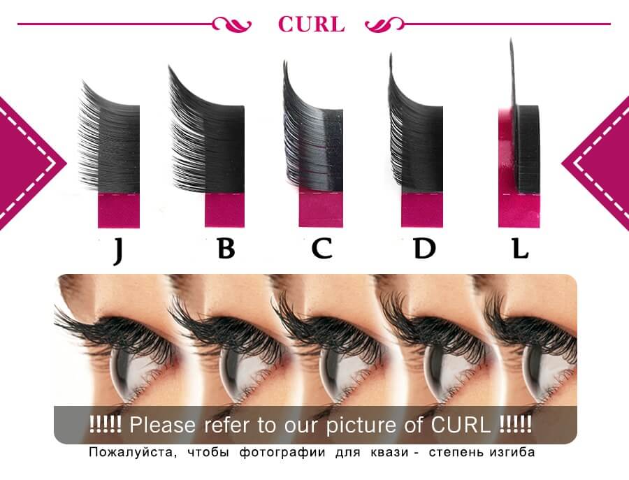 Завиток делается с помощью специального оборудования под воздействием высоких температур. В итоге получается одна ресничка длиной около 7 см, которая потом разрезается и шлифуется, чтобы кончик был тоньше основания, как у естественной ресницы. Существует несколько видов изгибов.