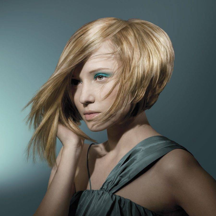 - скрыть недостатки круглого или угловатого квадратного лица можно с помощью асимметричного боба и косой челки; по бокам при этом оставляются прямые прядки с удлинением и жесткими кончиками, уходящими по диагонали вниз.
