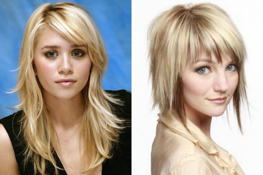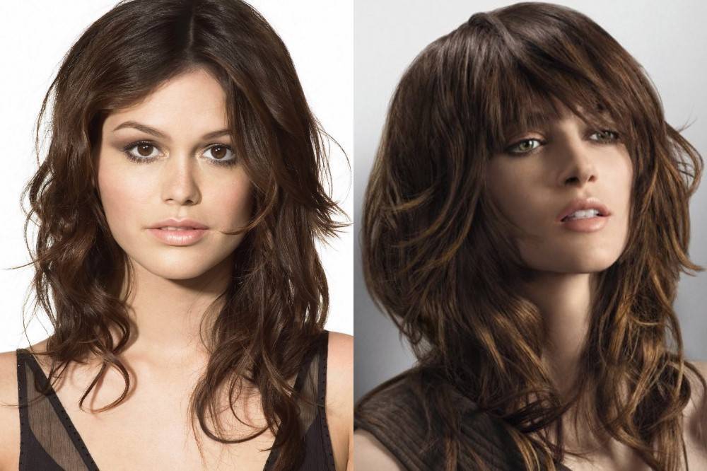 Хорошо смотрится прическа на локонах средней длины с удлиненной по бокам челкой. Этот прием зрительно вытягивает контур лица. Еще можно филировать прядки по бокам.