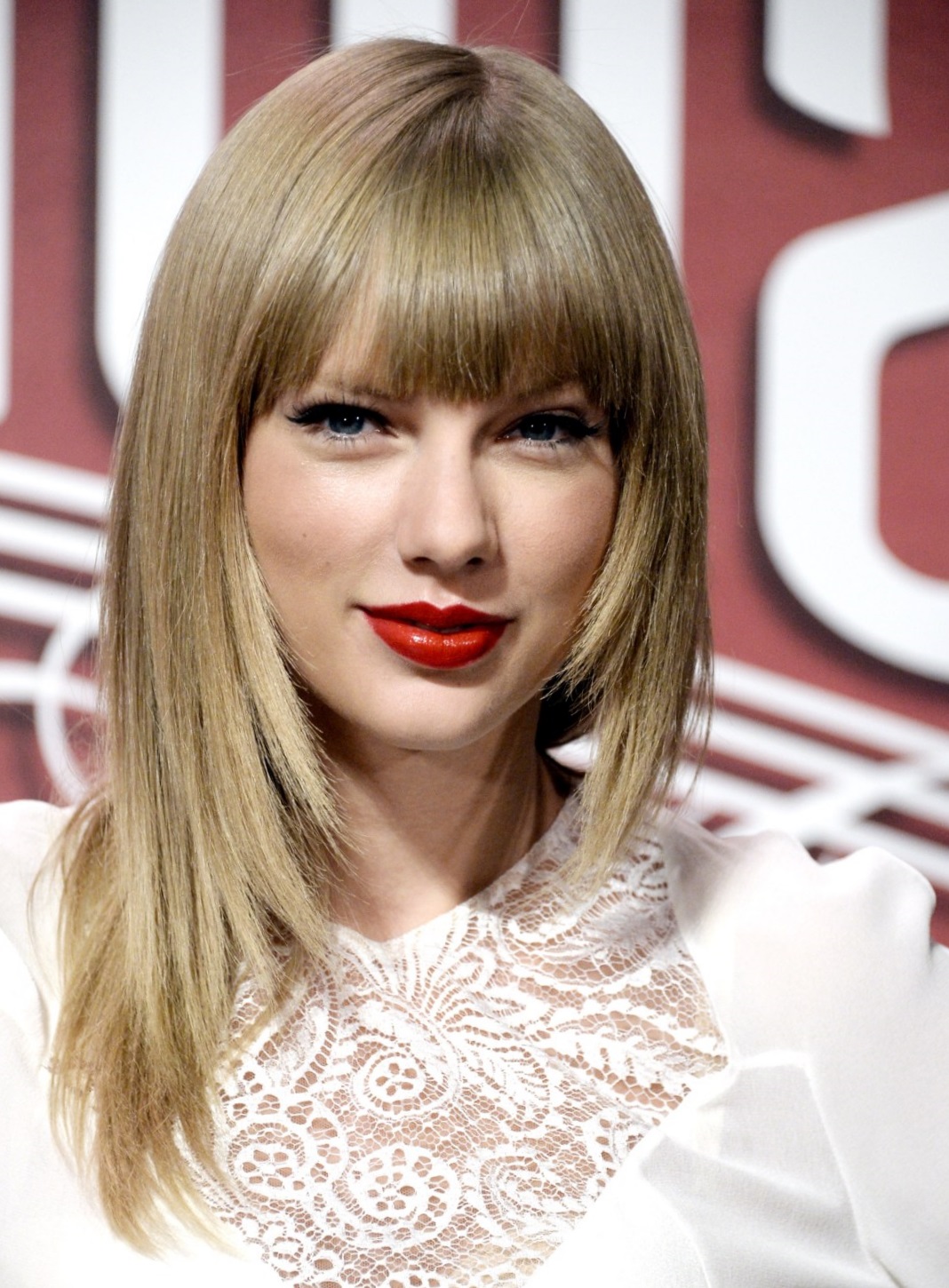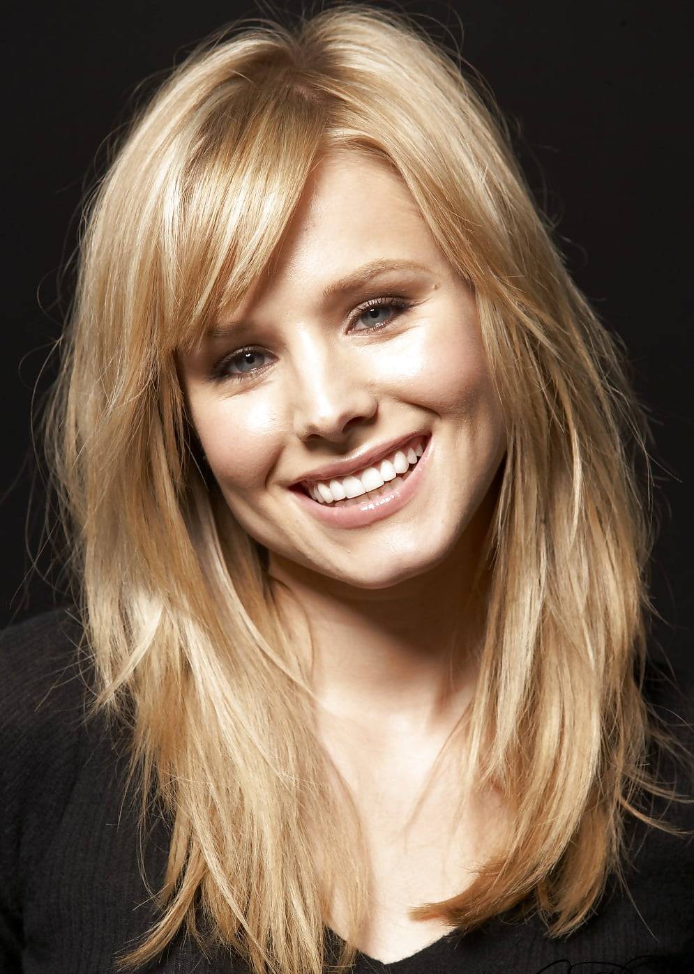 Великолепная лесенка, смягчающая черты лица и прячет длинный лоб. Прическа с прямой челкой интегрированной с подкрученными вовнутрь и четко выделенными кончиками выглядит объемной и делает волосы гуще. Чтобы не выглядеть как отличница-пятиклассница на первом звонке — слегка распушите волосы.