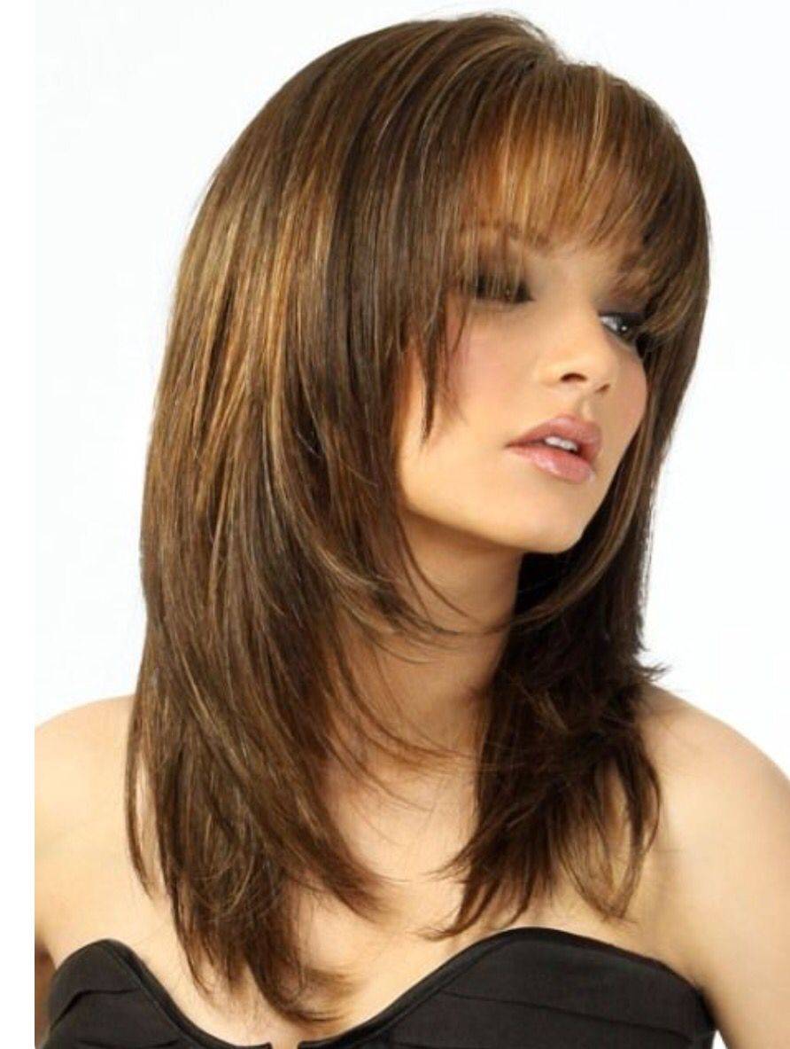 Стрижка лесенка с густой прямой челкой на средние волосы, фото