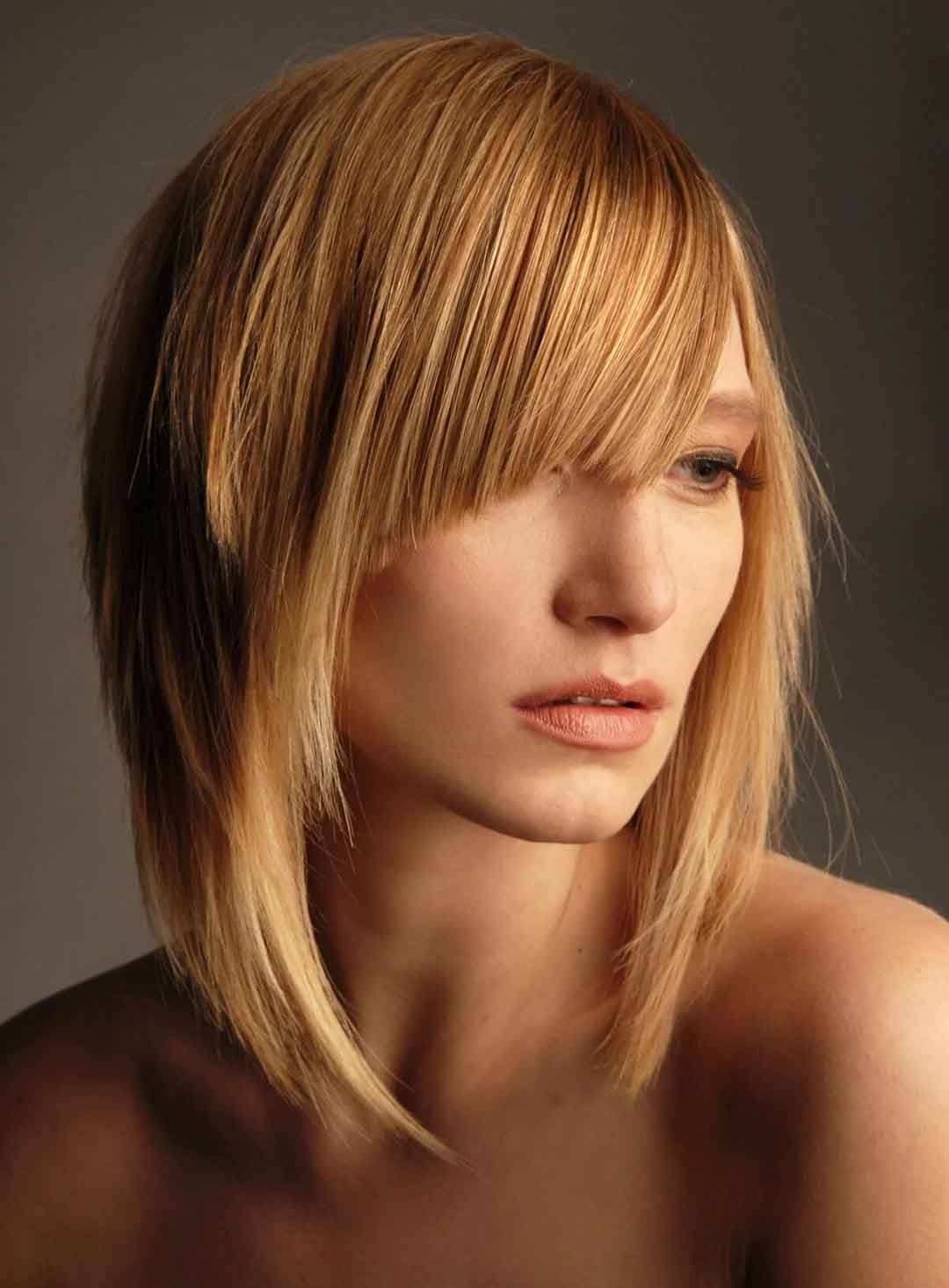 Стрижка лесенка с густой челкой на бок на средние волосы, фото