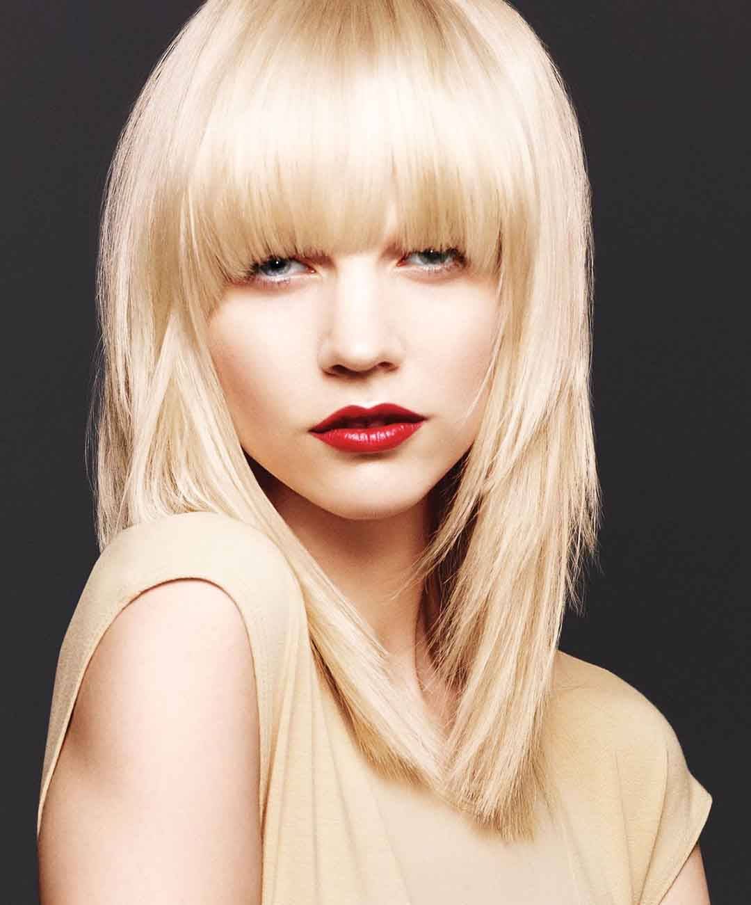 Стрижка лесенка с густой прямой челкой на средние волосы, фото