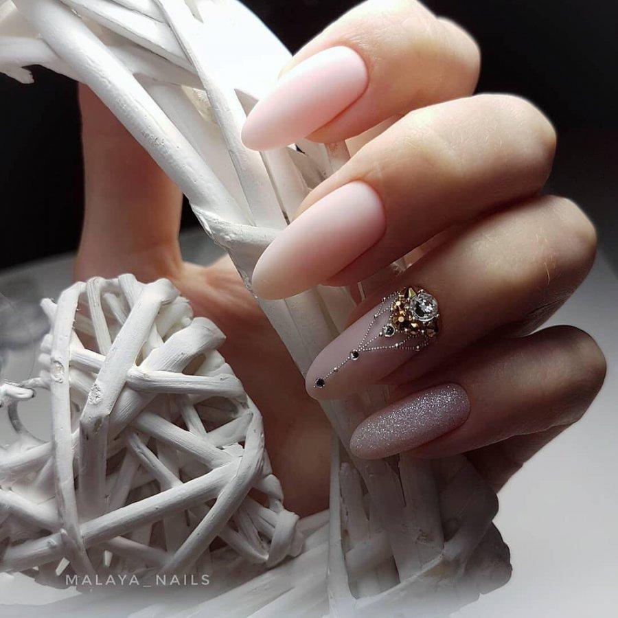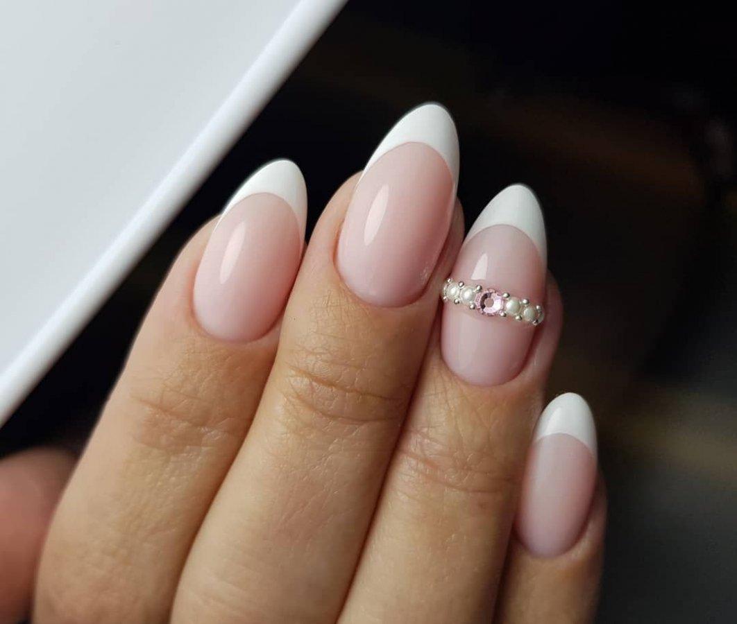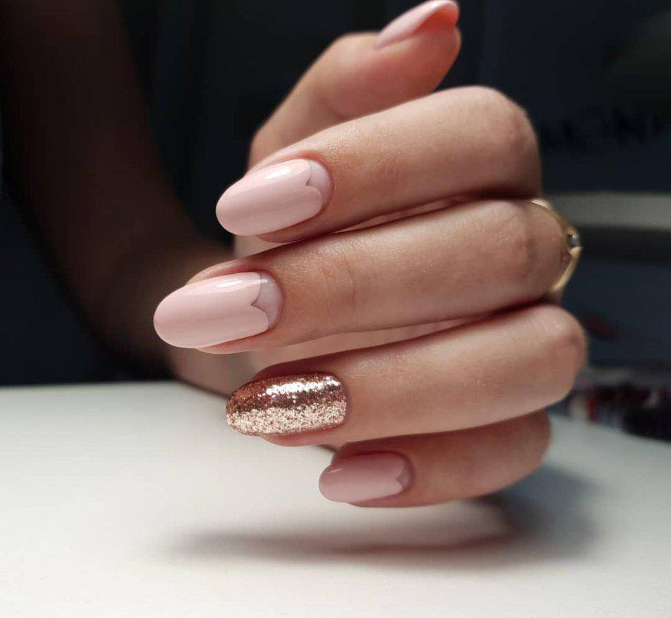 Основа бледно-розового цвета, либо телесная основа, также отлично подходят для дизайна ногтей под названием френч, можно применить матовое финишное покрытие. Миндальная форма ногтей также отлично подходит для нанесения френча.