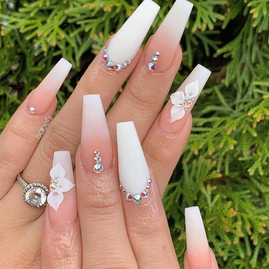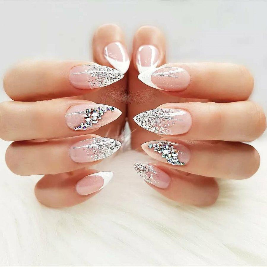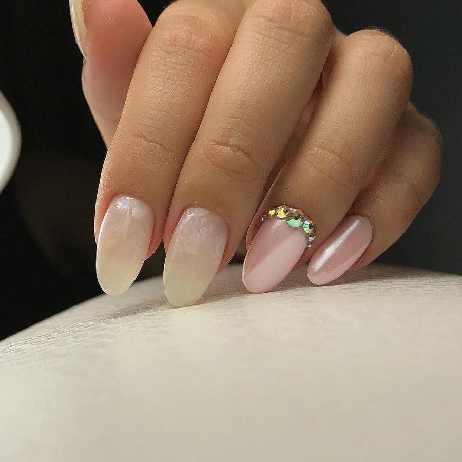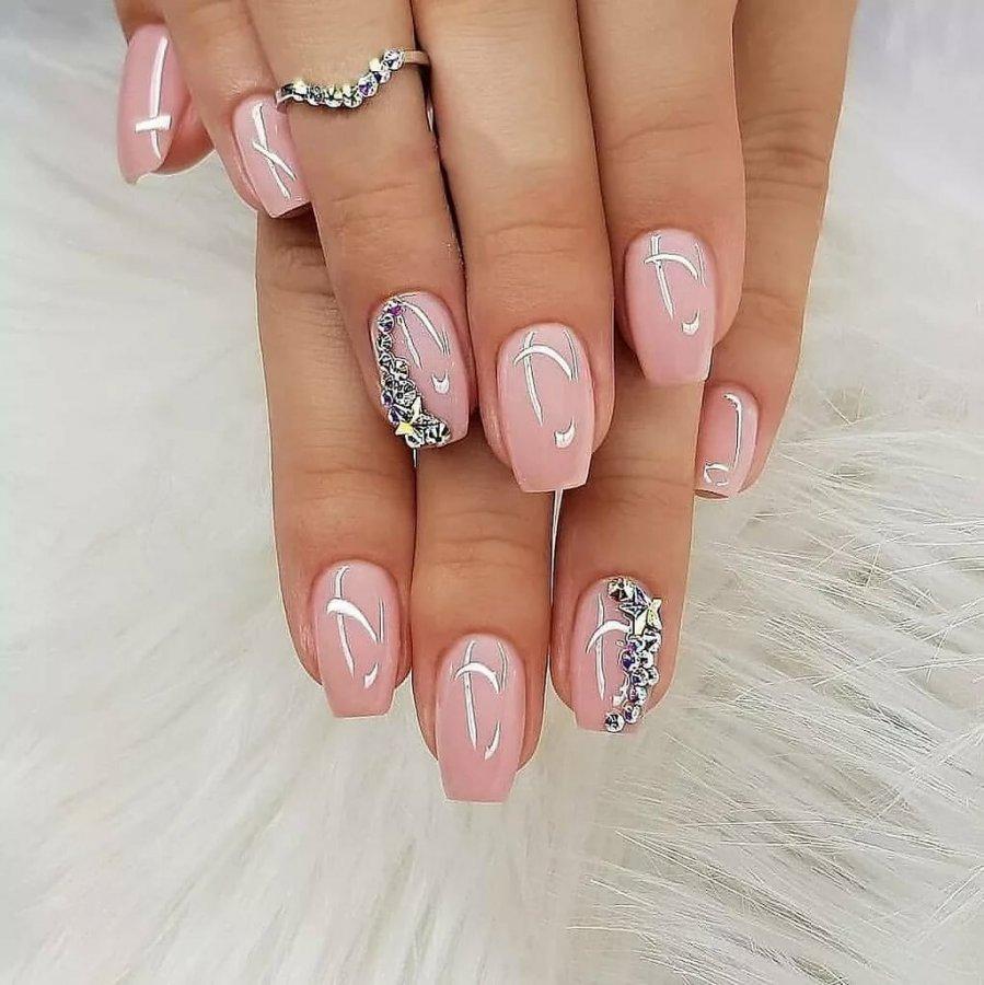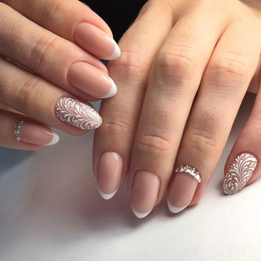 В маникюре невесты в 2022 году приветствуется лунный дизайн во всем своем великолепии, многообразии и лаконичности. Для такого торжественного события как свадьба отлично подойдет маникюр с использованием декора стразами: крупными и мелкими, разной формы и цвета.