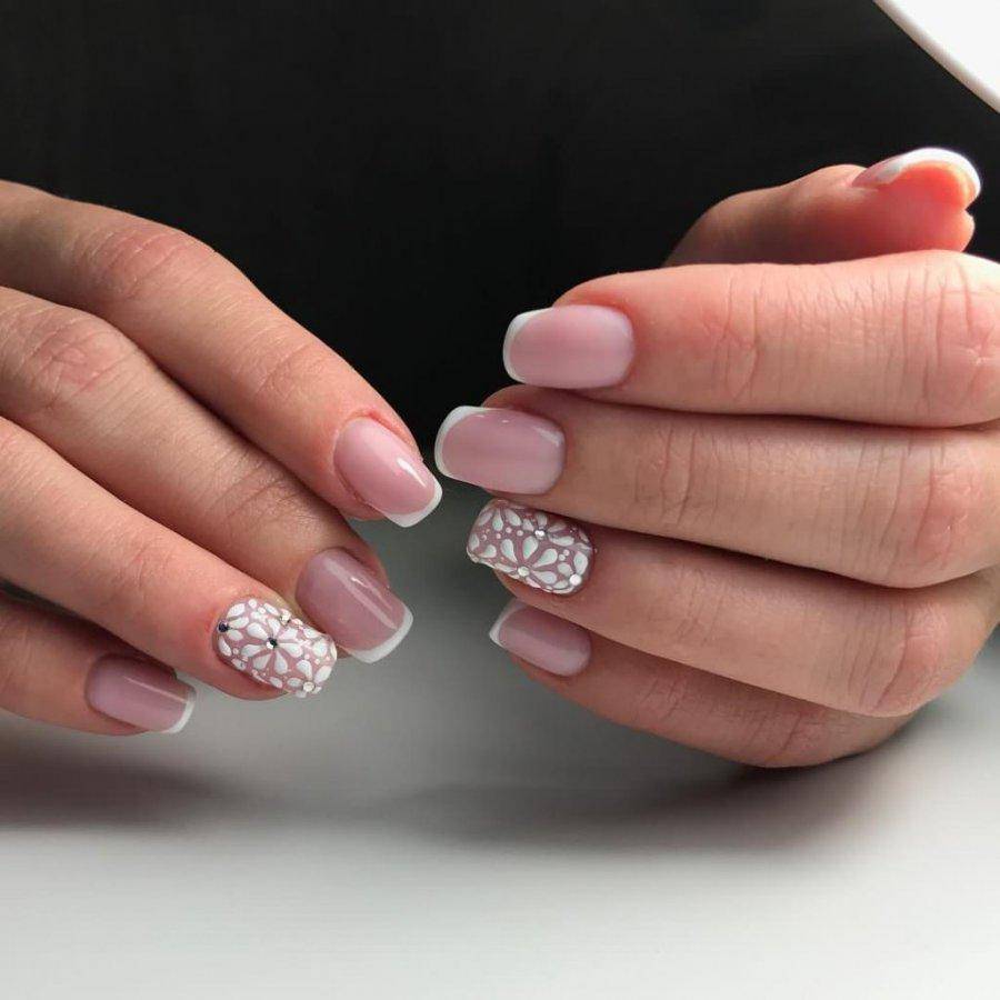 Бело – розовый френч идеально выглядит на квадратной форме ногтей, даже без применения элементов декора. Укороченная длина при этом лишь подчеркнёт изящность ваших рук. Квадратная форма является выигрышным вариантом запила ногтевой пластины в качестве основы под френч. Выполнение в гелевом исполнении или варианты росписью, элементы лепки или использование других видов дизайна, в любом своём виде квадратный свадебный френч будет актуален.