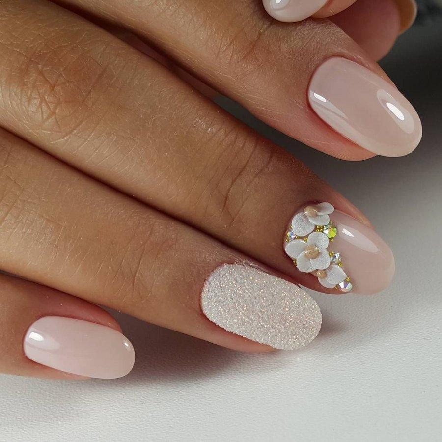 Для свадебного маникюра в качестве дизайна уместно выбрать объемную и трудоемкую лепку, которая дополняется эффектными деталями: стразами, кристаллами, крупными блестками, декоративными камешками.
