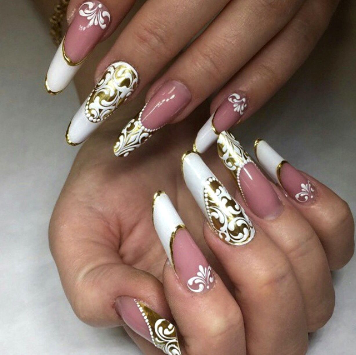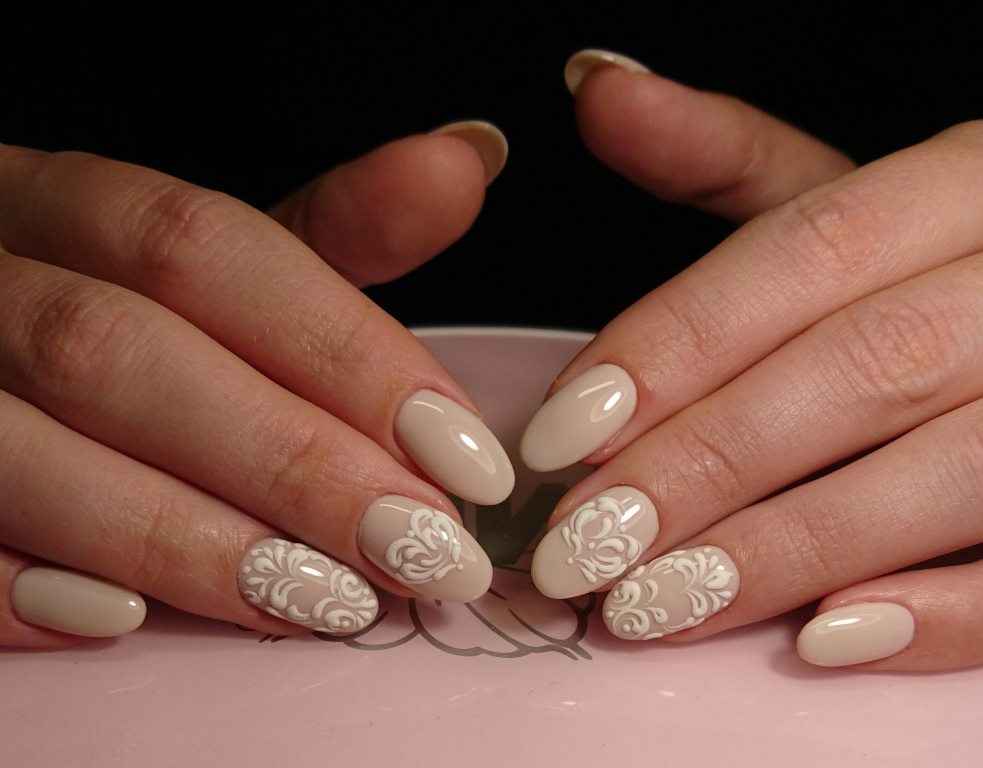 именно аристократическая сдержанность, романтичные узоры и симметричная геометрия способны гармонично украсить длинные ногти невесты и стать актуальным трендом сезона.