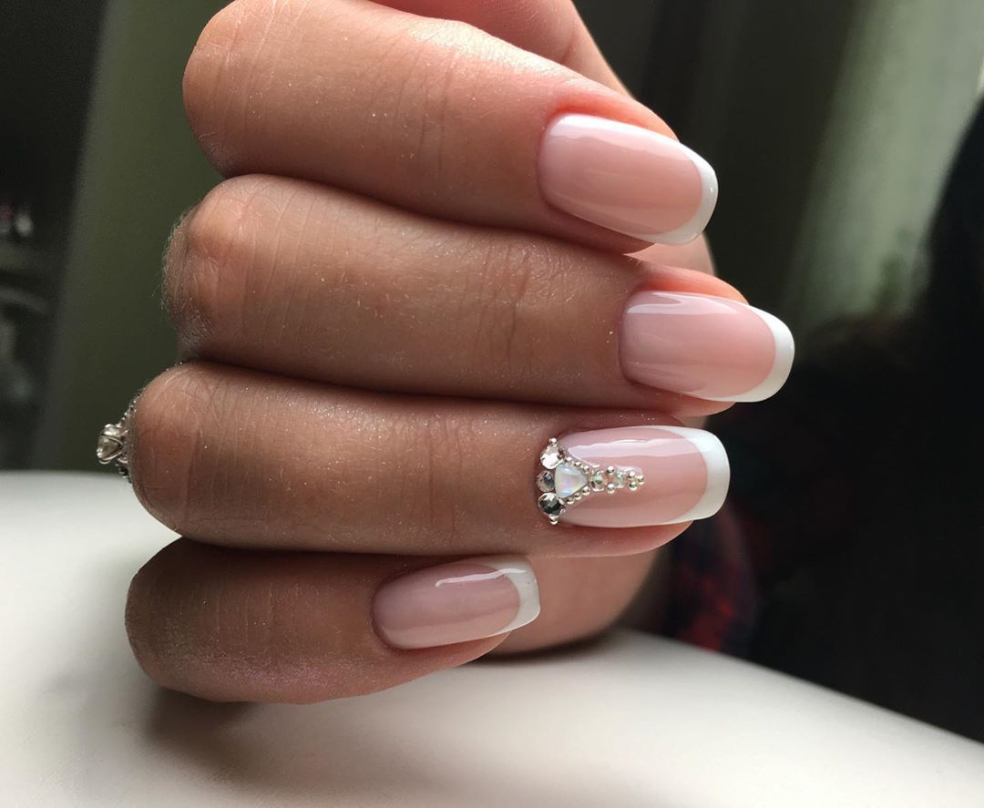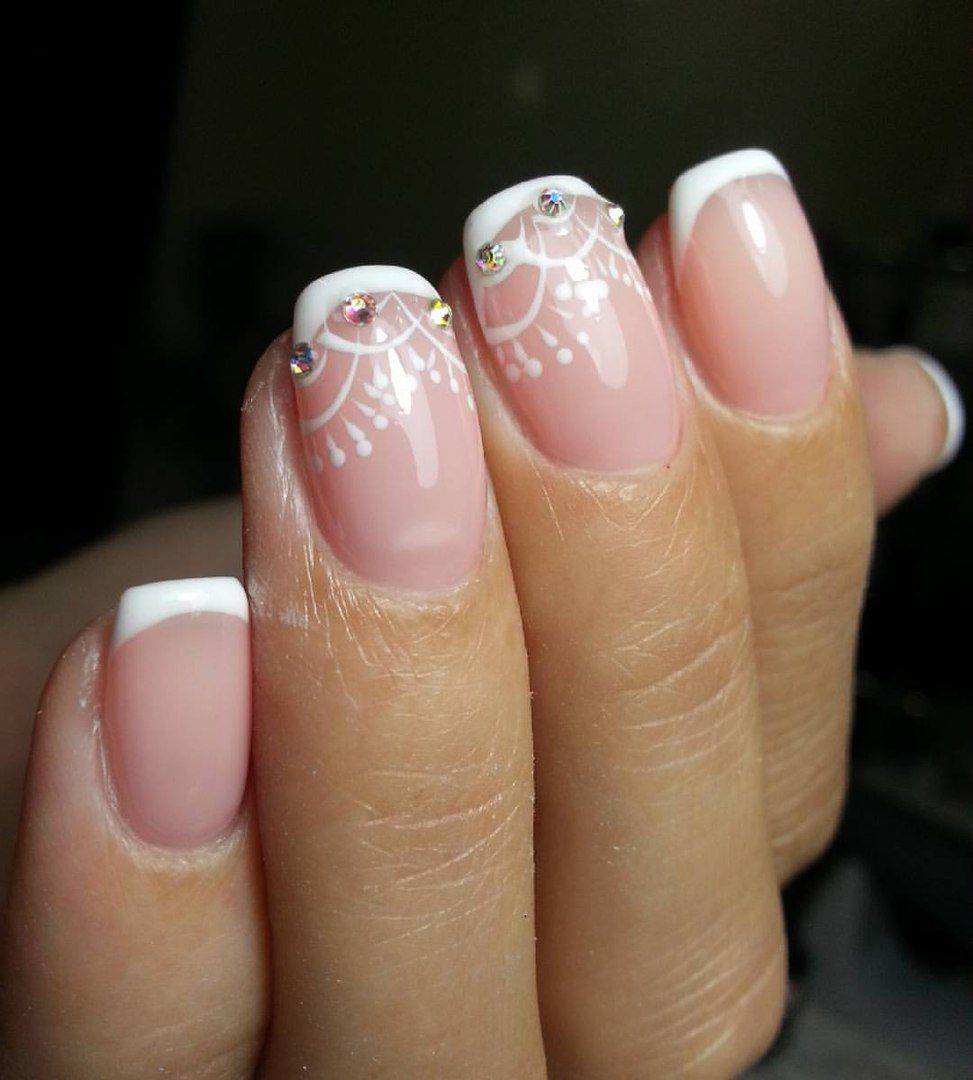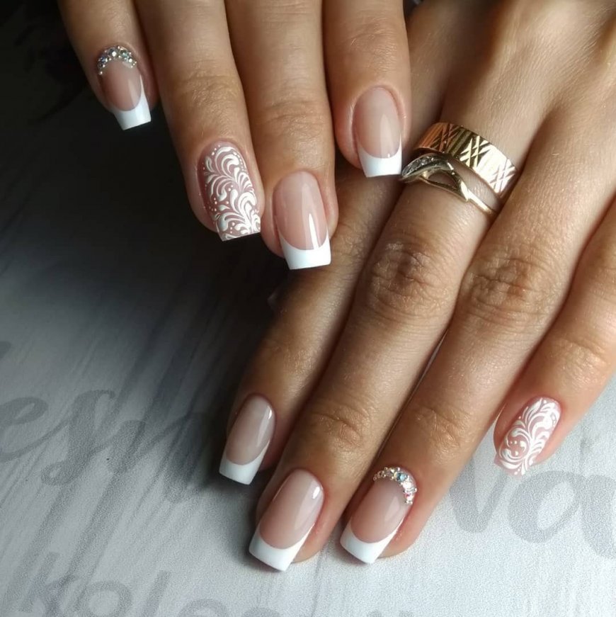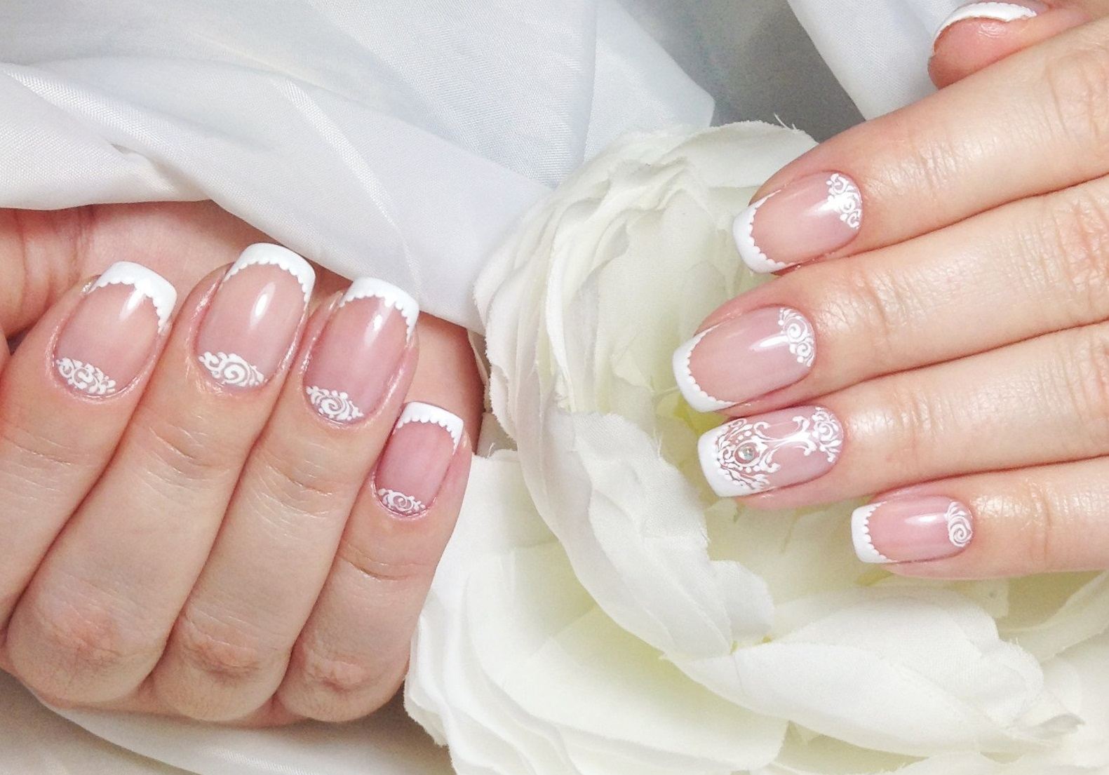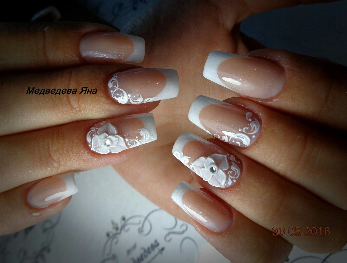 Французский свадебный маникюр дает большой полет для фантазии и творчества. На нем замечательно смотрятся: