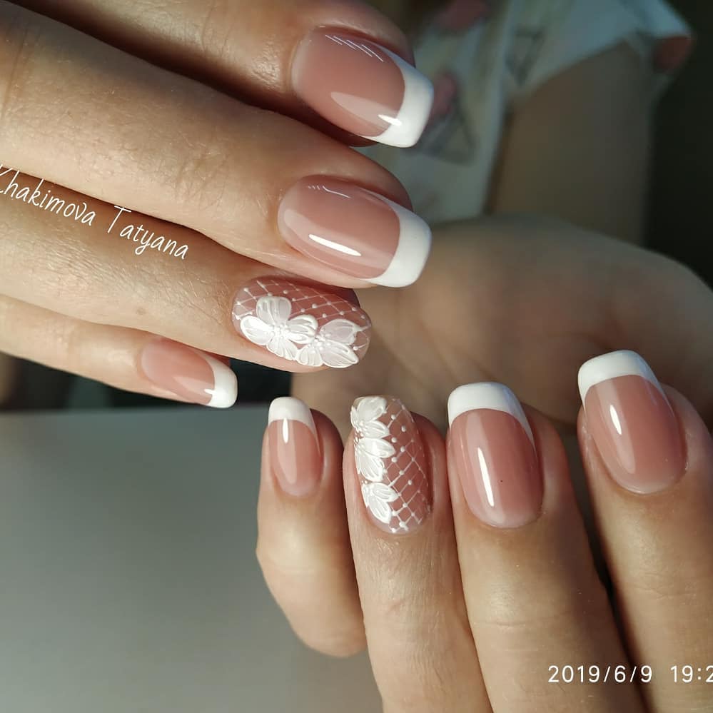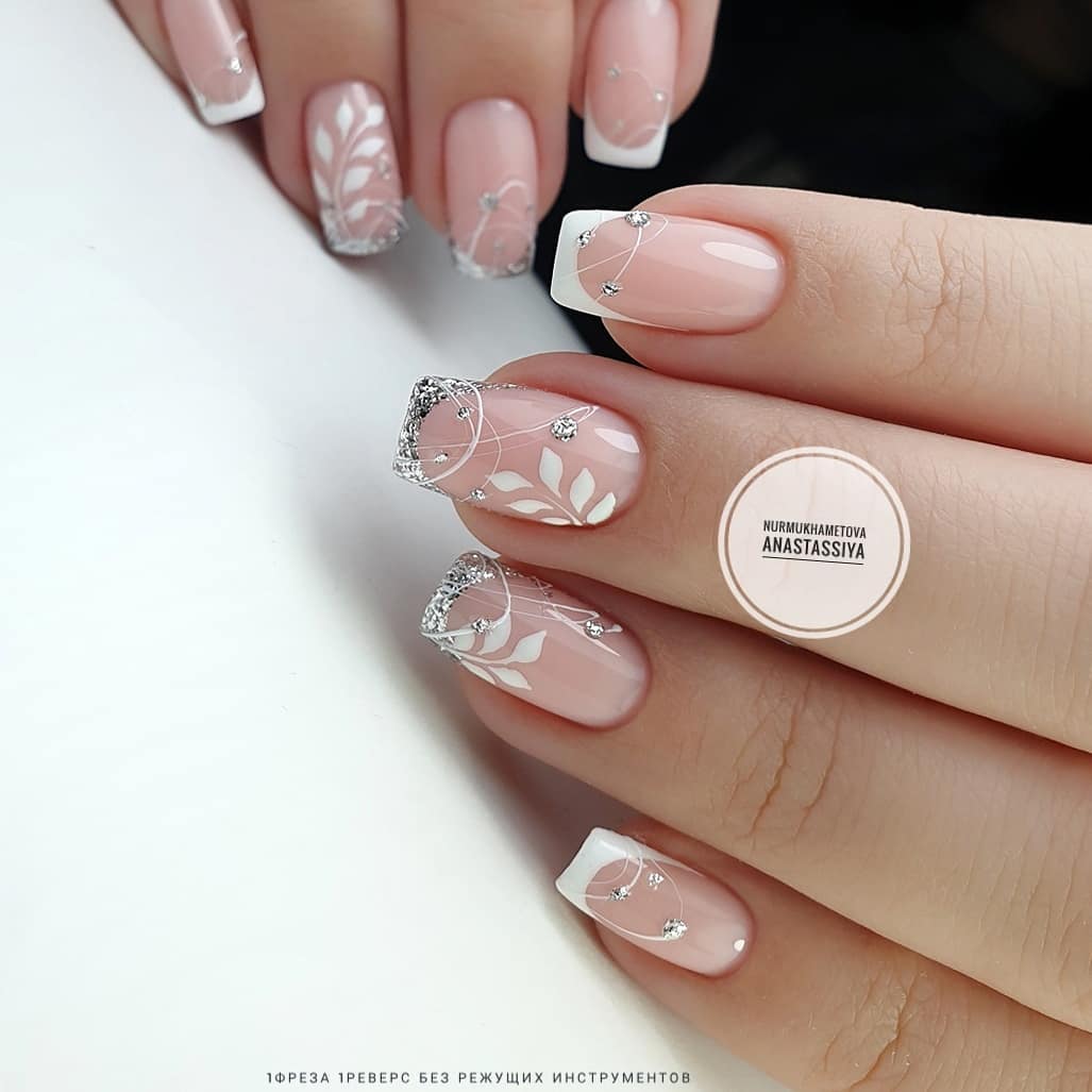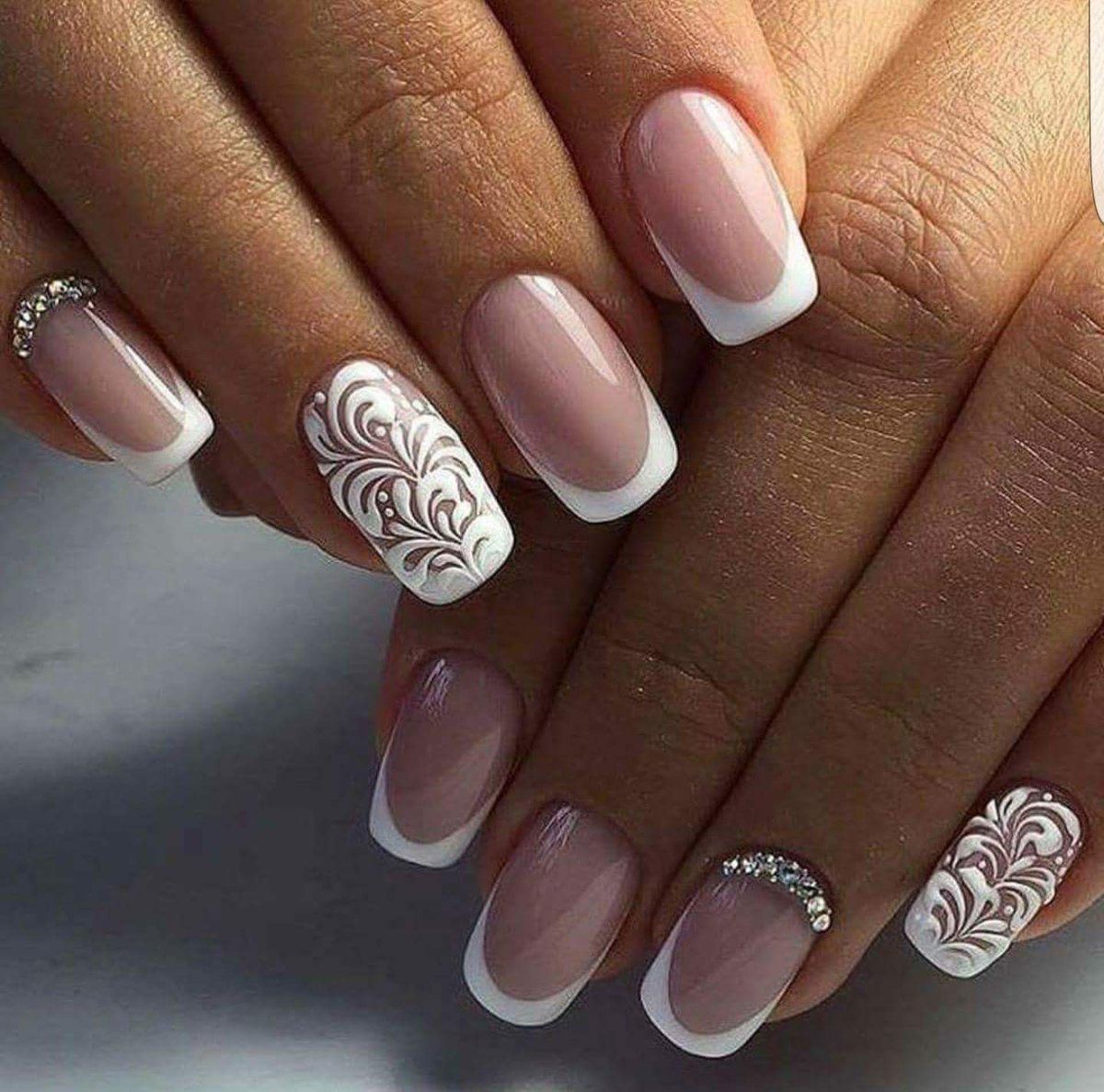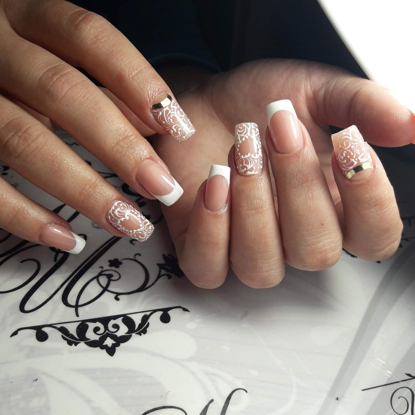 Французский свадебный маникюр дает большой полет для фантазии и творчества. На нем замечательно смотрятся: