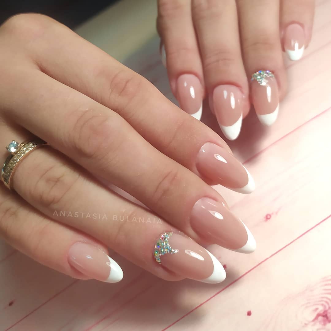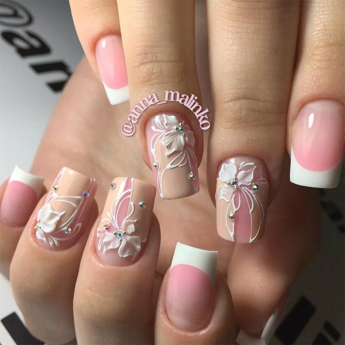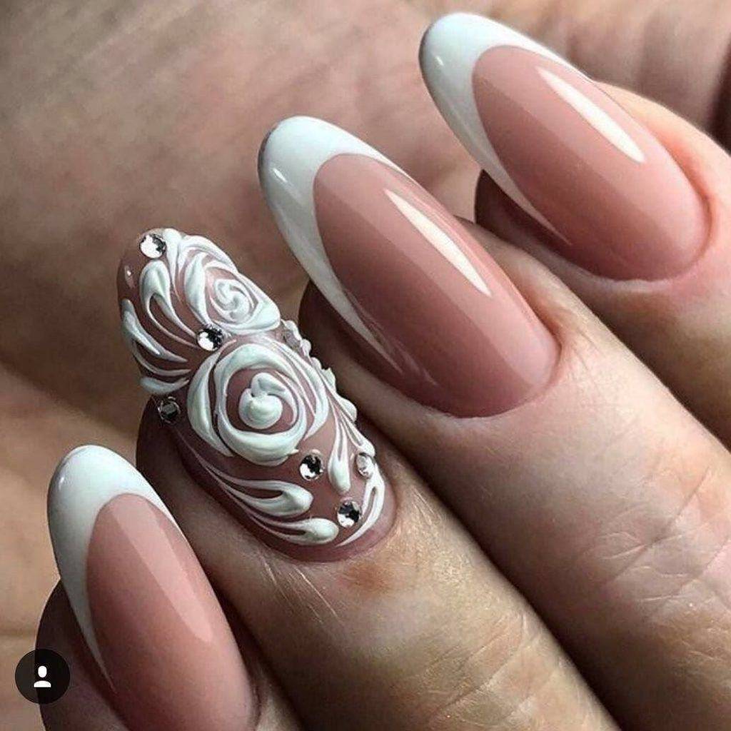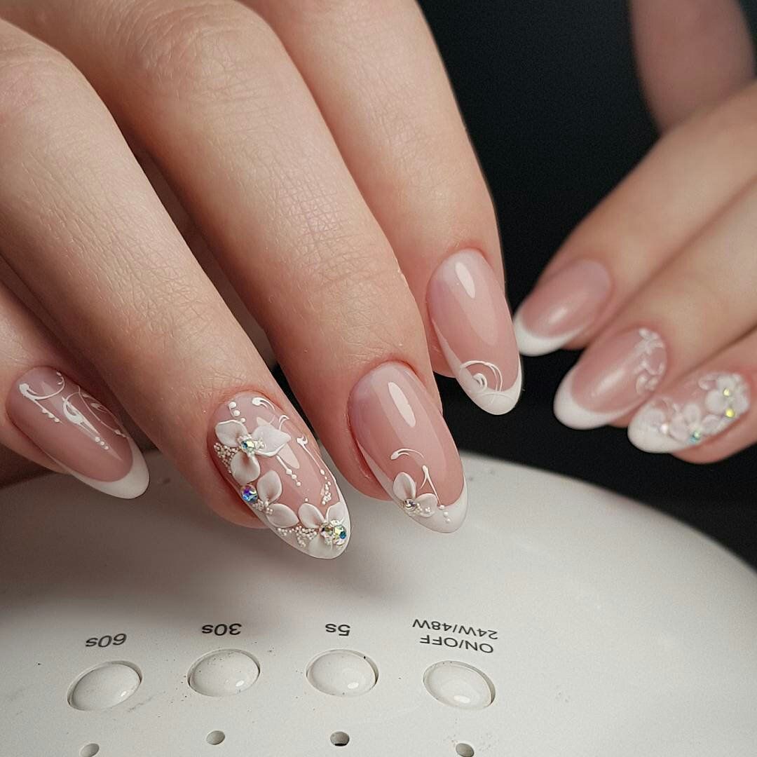 Французский свадебный маникюр дает большой полет для фантазии и творчества. На нем замечательно смотрятся: