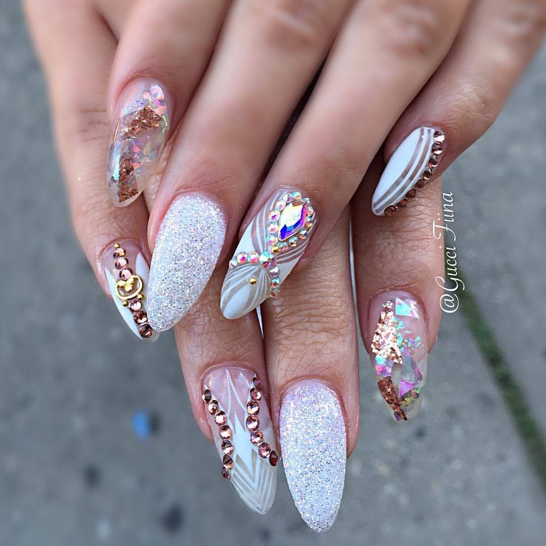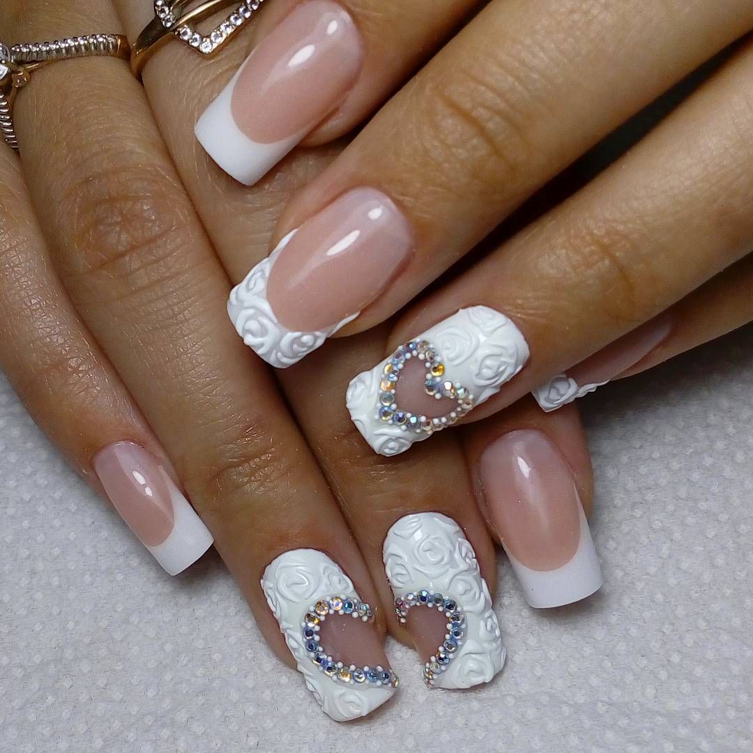 «Объемный».Этот вариант также входит в топ «Свадебный маникюр 2019». Однако это очень непрактичный вид дизайна, но выглядит он, конечно, шикарно! Ногти украшаются лепниной, стразами. Здесь будет много объемных элементов. «Вау-эффект» Вам гарантирован, но с такими ногтями крайне неудобно что-то делать. Отправляясь в свадебное путешествие, Вам, хочешь-не хочешь, придется снимать всю эту красоту.