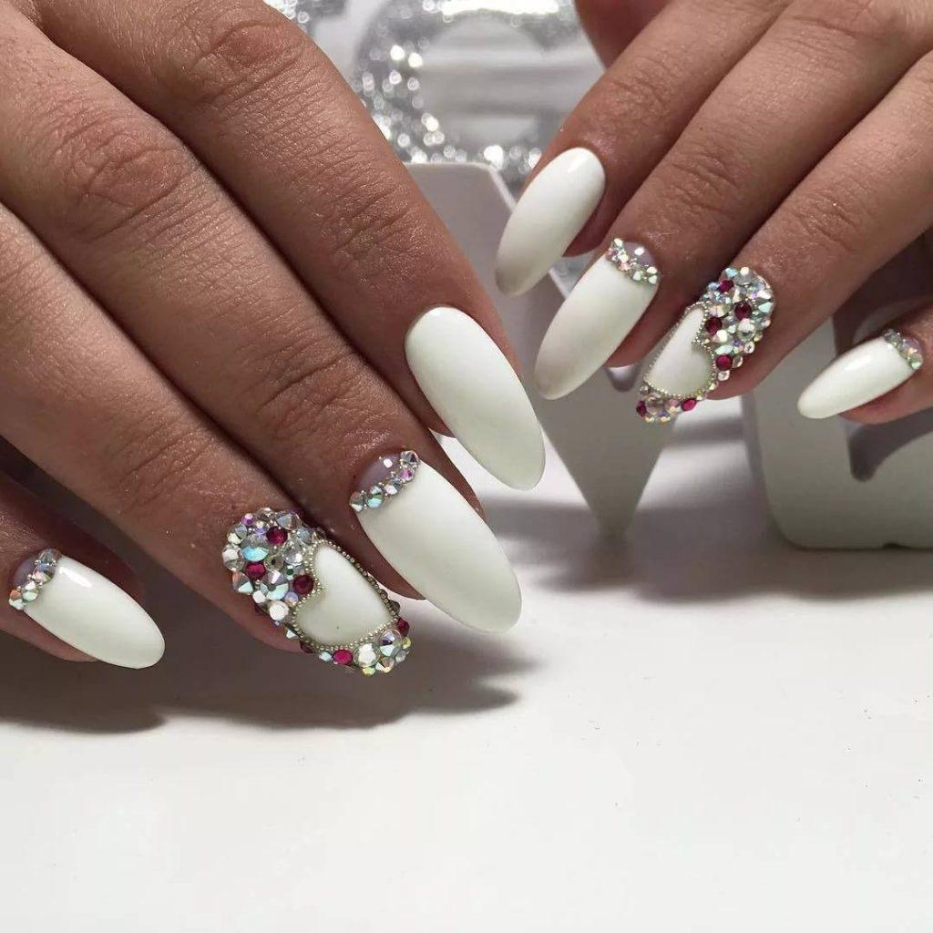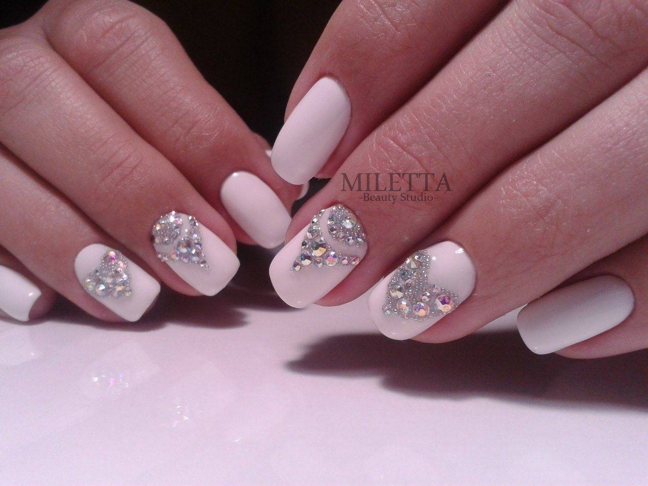 Свадебный маникюр со стразами подойдет к любому наряду, может быть выполнен в любом цвете, близком к цветовой гамме образа невесты.
