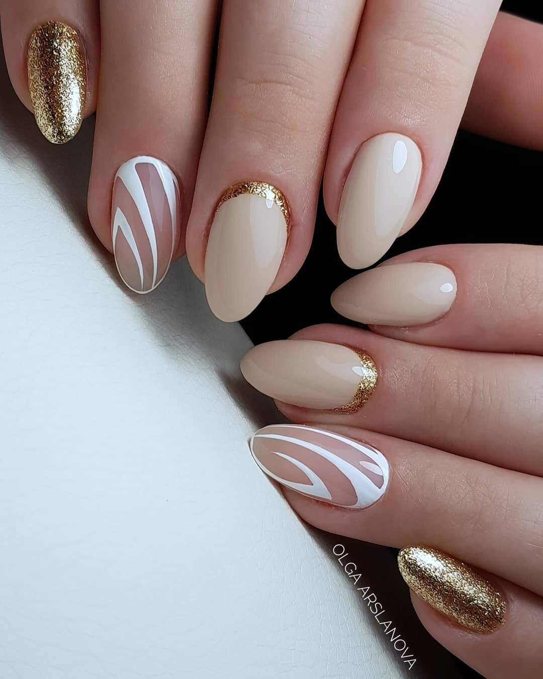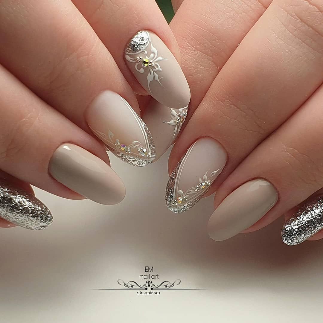 Бежевый в белом оформлении поразит своей нежностью и лёгкостью. Он создаст абсолютно совершенный образ невесты. Стилисты рекомендуют свадебный маникюр в бежево-белых тонах.