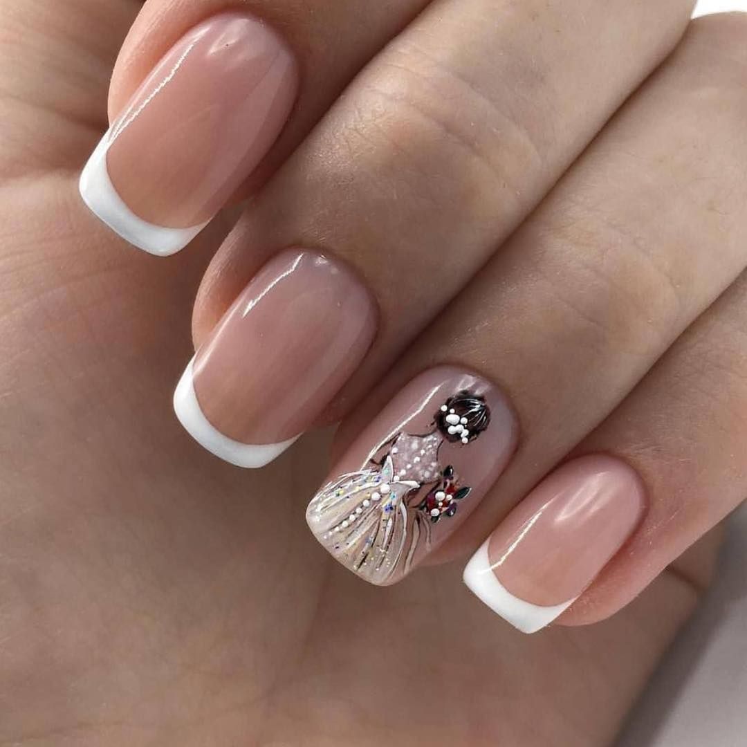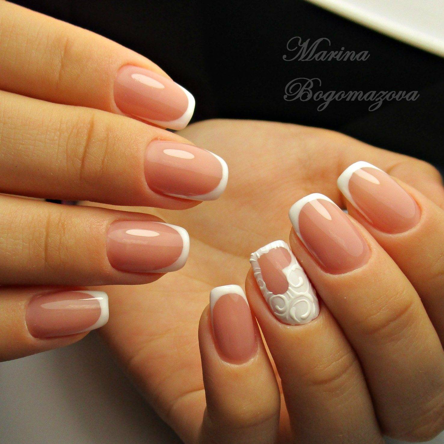 «Френч». Неустаревающая классика, которая никогда не теряет своих позиций, поскольку всегда выглядит изящно и очень элегантно, и может называться свадебным маникюром на короткие ногти и не только. Французский маникюр говорит о хорошем вкусе своей обладательницы. В классическом варианте ноготь остается прозрачным, а его кончик красят в белый цвет. Иногда кончик может быть окрашен и в другие цвета, отступая от привычного повседневного варианта. Для свадьбы такой вид маникюра часто дополняют различными элементами. Главное – не переборщить.