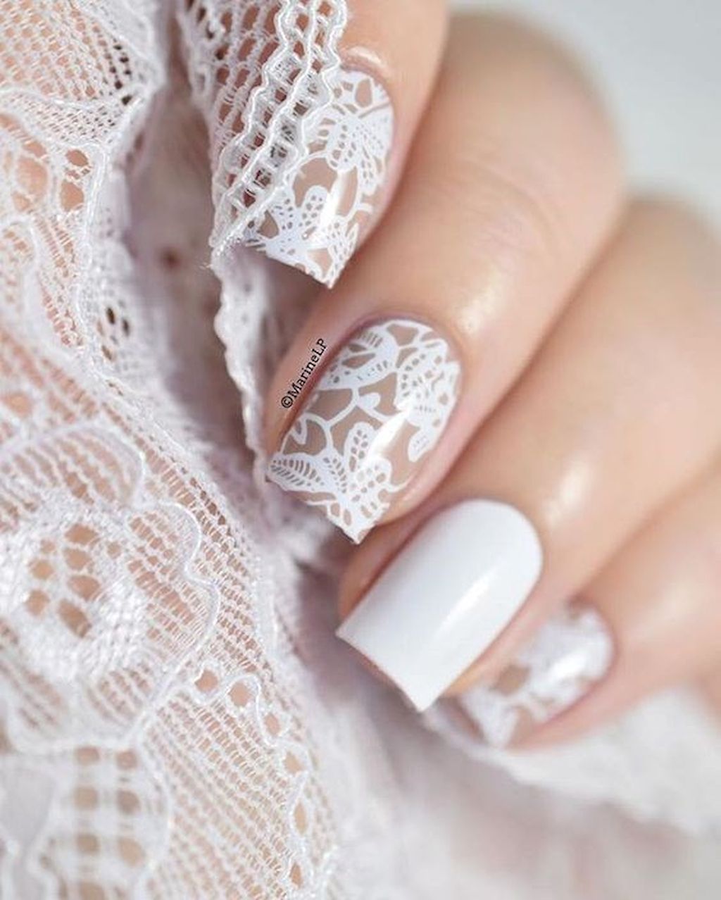 «Кружевной». Наверное, это самый женственный и нежный вариант. Он будет уместен даже как свадебный маникюр на короткие ногти.Кружево всегда смотрится великолепно. Не следует перегружать его излишними декоративными элементами – парочки страз будет вполне достаточно.