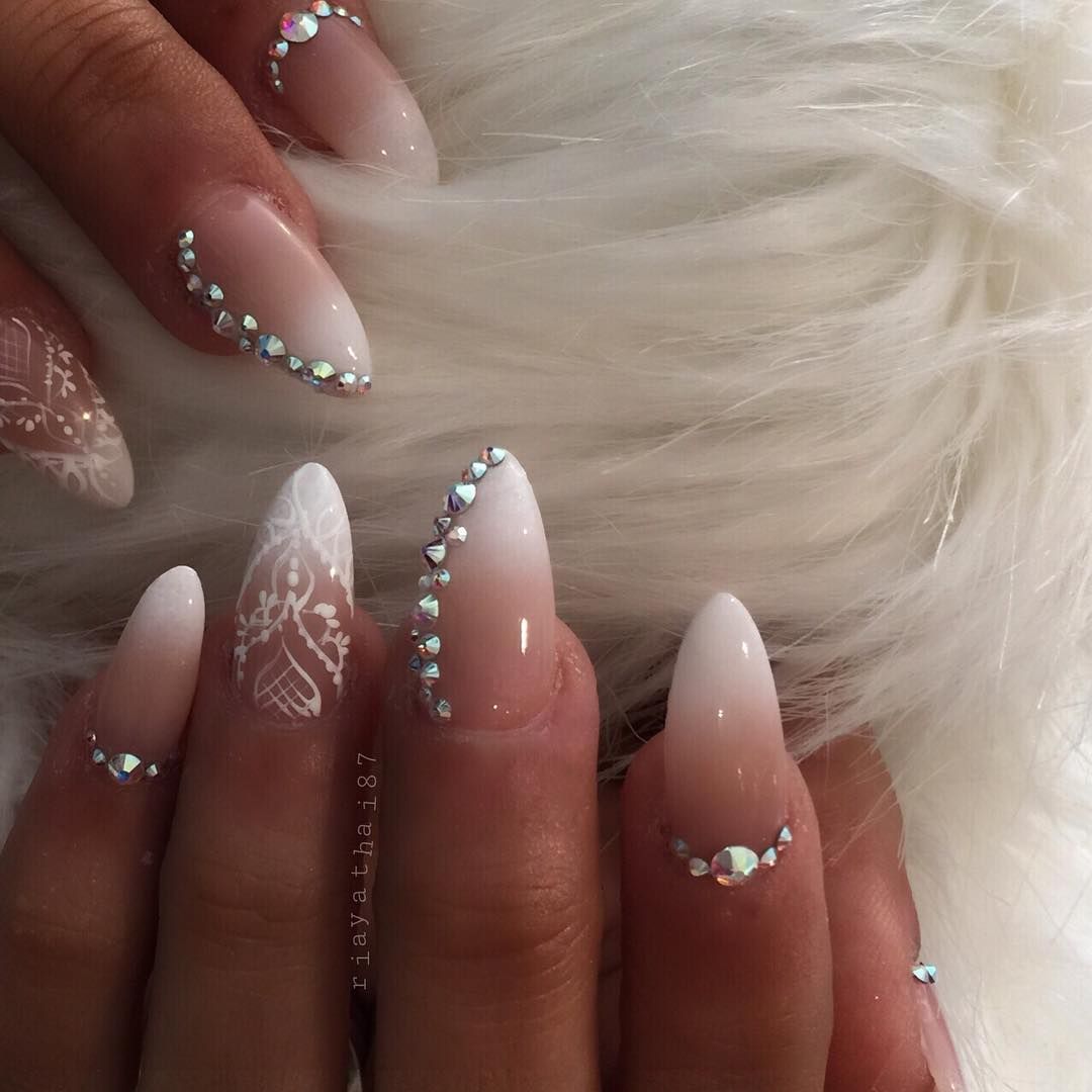 Розовый свадебный дизайн. Отдав предпочтение розовому, посмотрите фото свадебного маникюра с этим оттенком. Чаще всего невесты выбирают технику омбре. В этом случае белый оттенок плавно переходит в нежно-розовый цвет. Этот дизайн дополнен сиянием страз. Также яркий розовый оттенок может стать определенным акцентом, если вы нарисуете улыбку или подчеркнете кончики ногтей.
