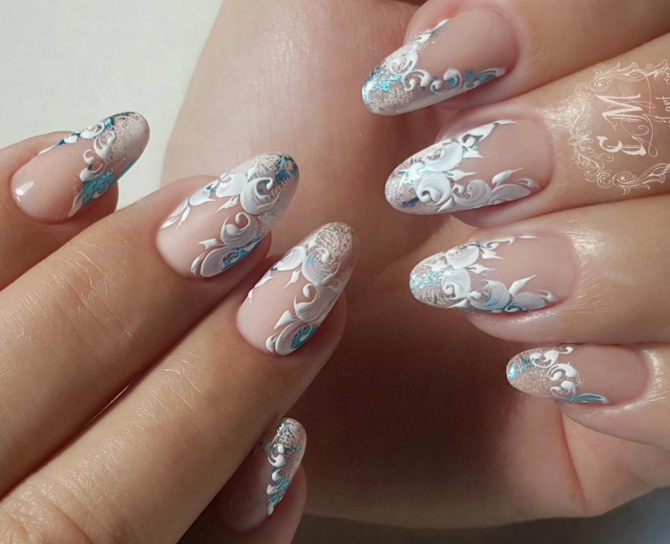А можно проявить свою яркую личность, сделать особый акцент на ногтях, тем самым отойдя от традиционного образа невесты. Из-за того, что в этот важный день невеста находится в центре всеобщего внимания, ей хочется выглядеть идеально. Поэтому многие девушки перед свадьбой делают наращивание ногтей искусственными материалами. С мастером маникюра необходимо оговорить все детали свадебного дизайна ногтей: длину, форму, рисунок, элементы объемной лепки или аквариумный дизайн.