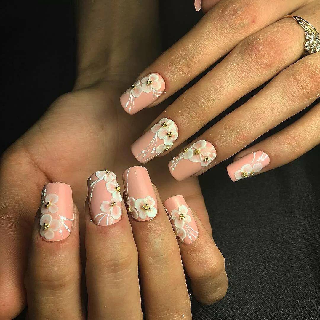 Крупные узоры на коротких ногтях выглядят некрасиво, а вот нежные, аккуратные цветы подчеркнут изящные пальчики невесты. Элегантно смотрится сочетание тонкого рисунка и 3D цветка, выполненного из акриловой глины, украшенного в центре драгоценным камушком или жемчужинкой. Красочные букеты, лепестки отлично сочетаются с яркими акцентами свадебного наряда.
