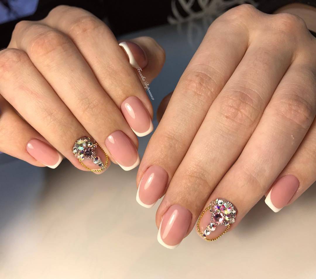 Классический френч иногда кажется очень скучным и хочется сделать его ярче. Стразы подойдут здесь как нельзя кстати. Праздничным вариантом френча может быть бежевый маникюр со стразами.