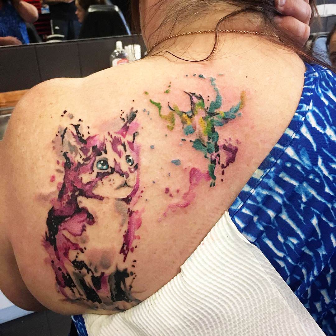Животные и насекомые. Среди земной фауны предостаточно существ, которые достойны стать центром тату-композиции в стиле акварель. Девушки выбирают прекрасных и легких бабочек, пчелок, всевозможных птичек, рыбок, котят.