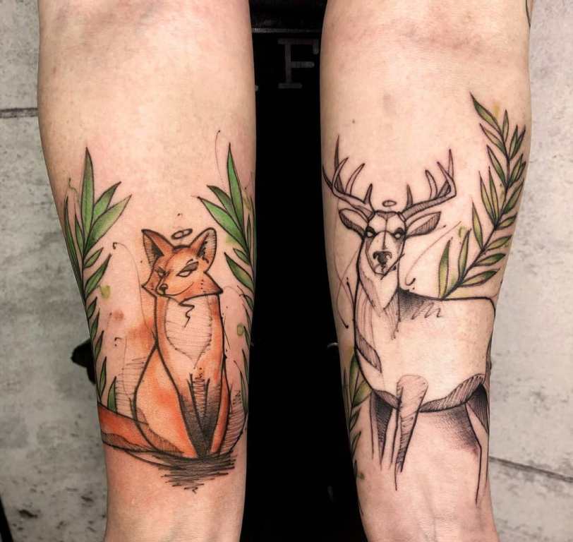 Кажется, сложно представить живописную технику с ее особенностями в композиции с каким-то другим стилем, но нет ничего невозможного, как говорится. К примеру, грамотное сочетание графики и акварели выступает замечательным подспорьем для создания различных рисунков животных. Такие татуировки выглядят очень смело, свежо и необычно, будто бы каркас, набросок из прямых и четких линий, вдруг избавляется от геометрических оков, обретая свободу и оживая на человеческом теле.