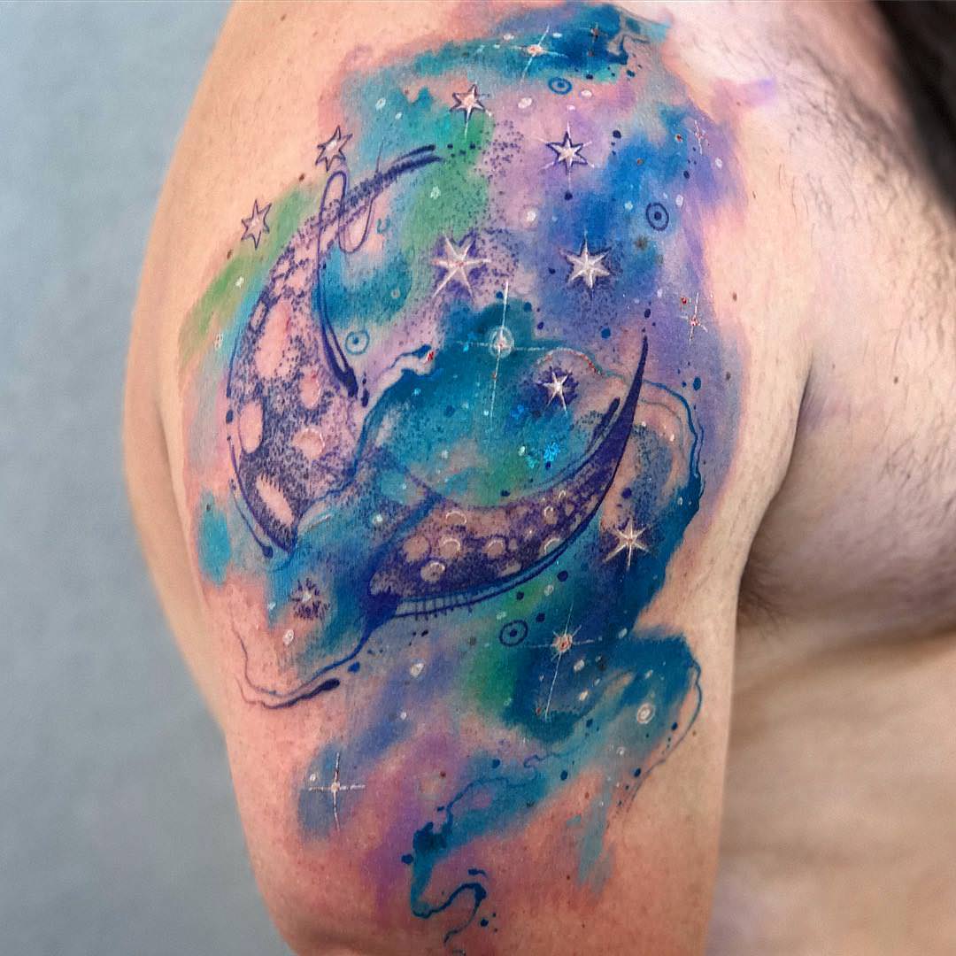 Пейзажи. Как удержаться и не набить прекрасную картину, изображающую дивный зеленый луг с яркими вкраплениями полевых цветов, или же кусочек прекрасного океана, словно оживающего на коже и разбрасывающего мелкие брызги воды вокруг, или далекий космический пейзаж с его расплывчатыми звездами и планетами, который будто вот-вот охватит все тело? Эти идеи очень сложно описать словами, но можно реализовать в акварельной технике, и поверьте, это будет невероятно красиво.