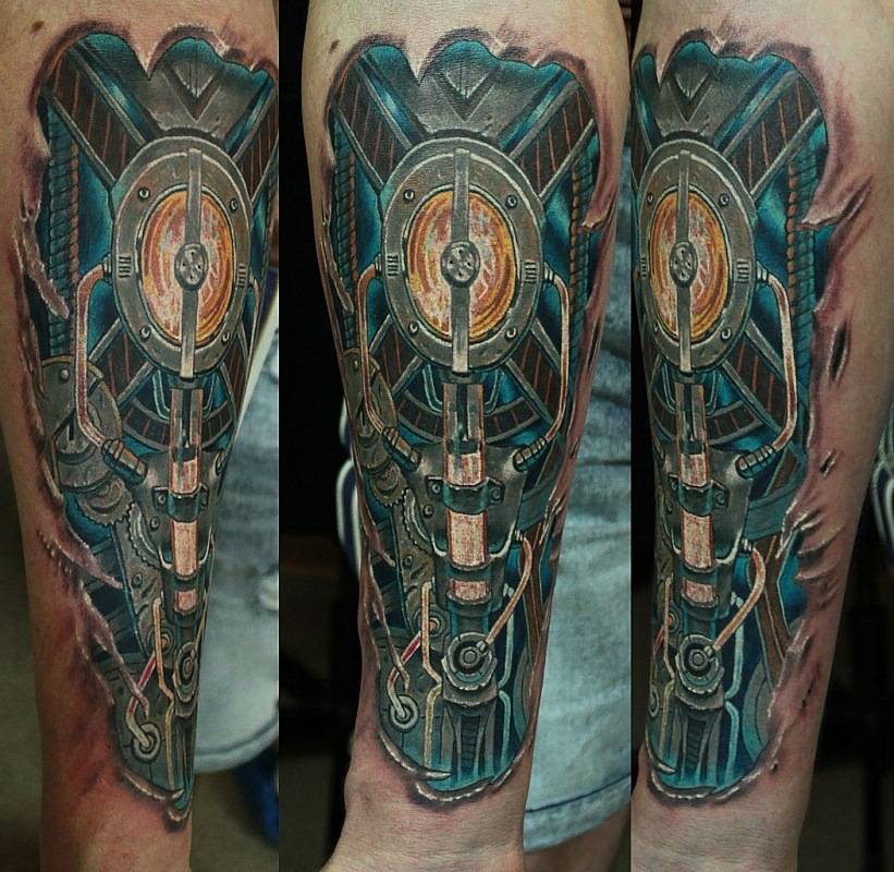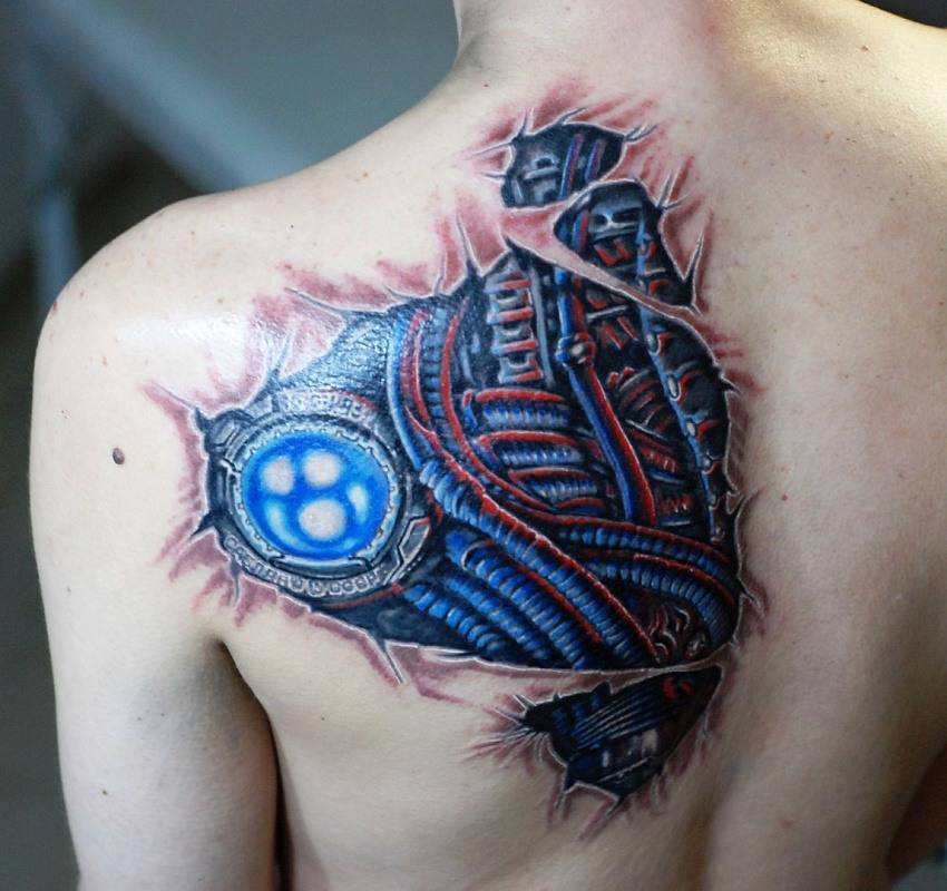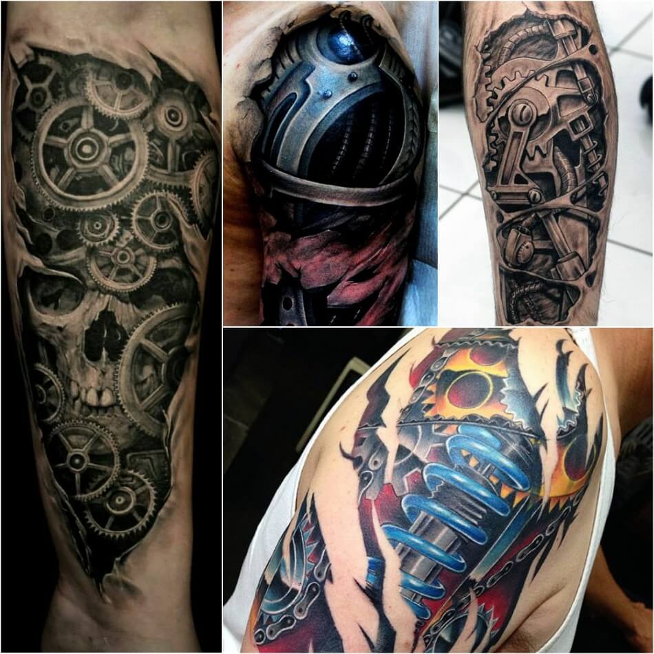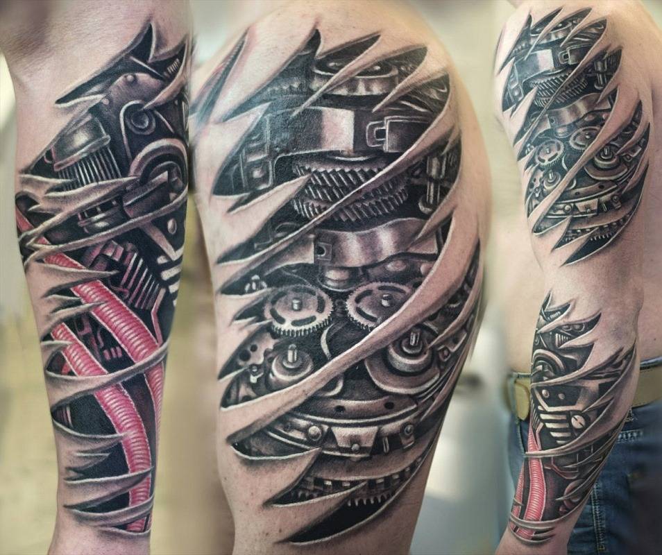 - Сама биомеханика. Татуировки, где механизмы изображены как часть человека. Обычно эскиз представляет собой разорванную плоть, через которую видны элементы механики внутри человеческого тела.