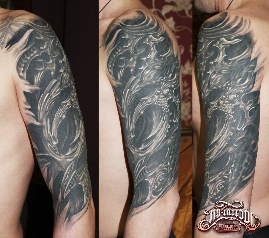Татуировка на плече в стиле биомеханики популярна из-за того, что строение мышц в этом месте помогает создать дополнительный объем. Рисунок кажется трехмерным и смотрится очень реалистично.
