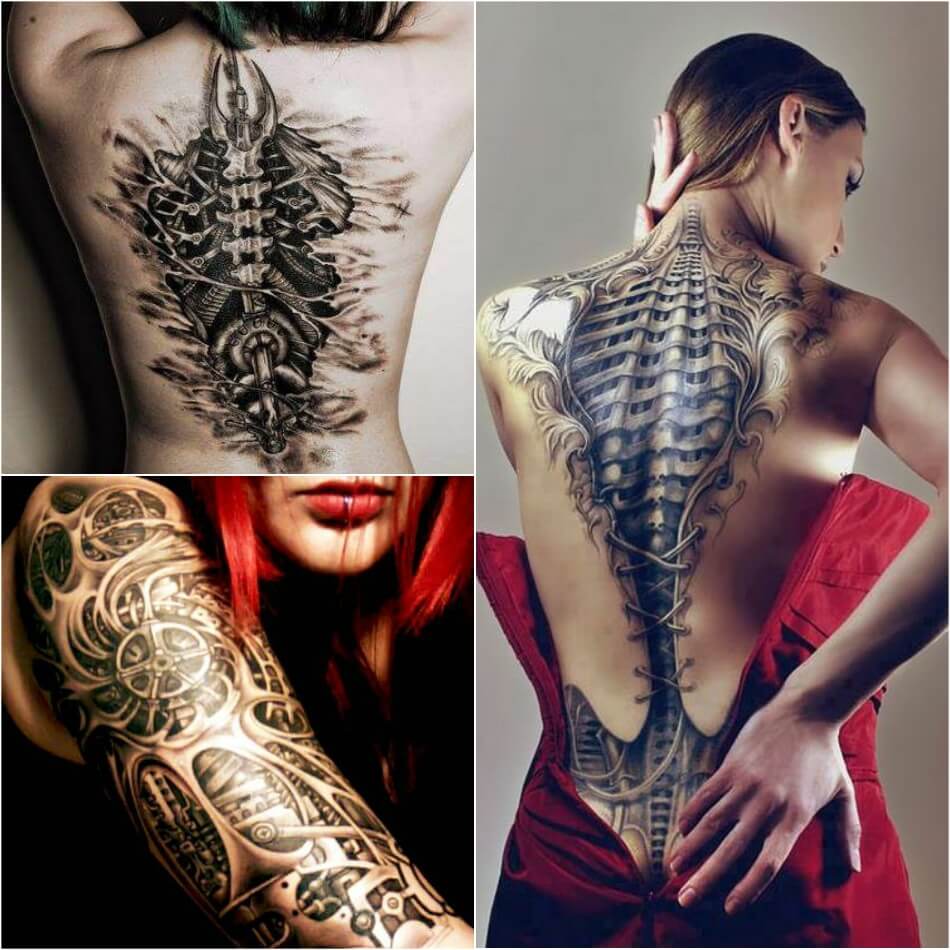 Несмотря на мнение, что татуировка биомеханика, фото которых мы чаще видим с мужчинами, является чисто мужской тематикой, девушки также часто делают на своем теле подобные рисунки. Однако, девушки часто предпочитают такую разновидность татуировки, как steam punk – там преобладают старинные механизмы с шестерёнками.