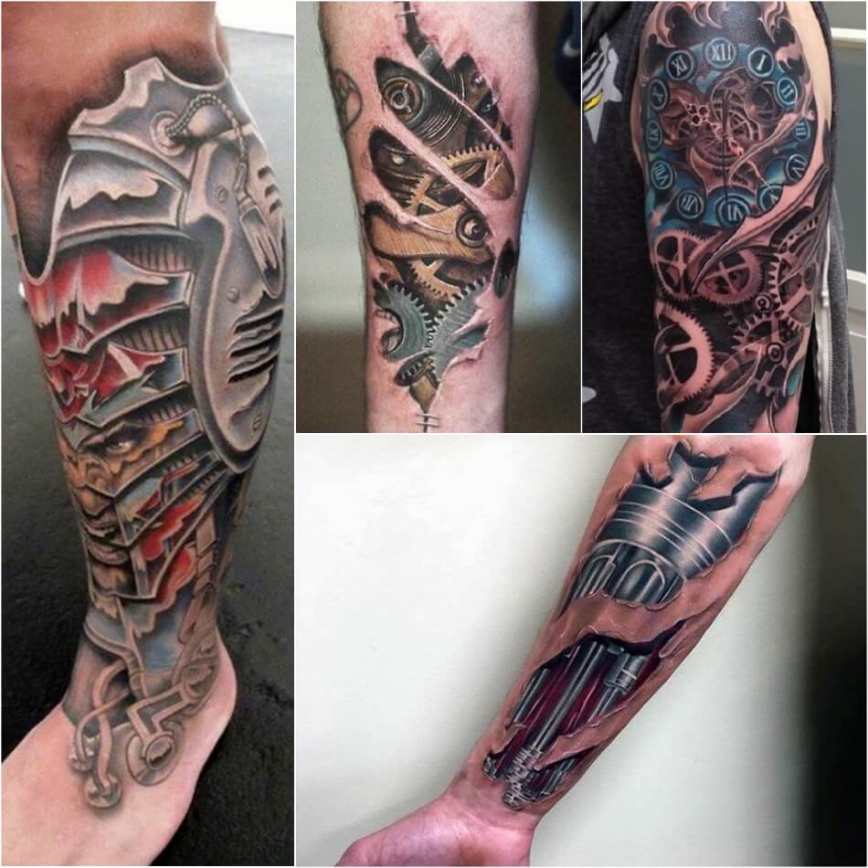 Это выглядит, словно настоящее тело заменили искусственным. Реализм также присутствует в таких эскизах. Лучше всего, когда мастер тату чувствует, что можно сочетать в единой картинке несколько характерных черт каждого из стилей. Тогда он сможет изобразить модную картинку с паровым кораблем и якорем или аристократа, надевшего круглые очки. Очень большую роль во внешнем виде такого изображения играют тени, ведь именно они придают нужный объем. Используя интересные цвета картинку можно сделать стильной и загадочной.